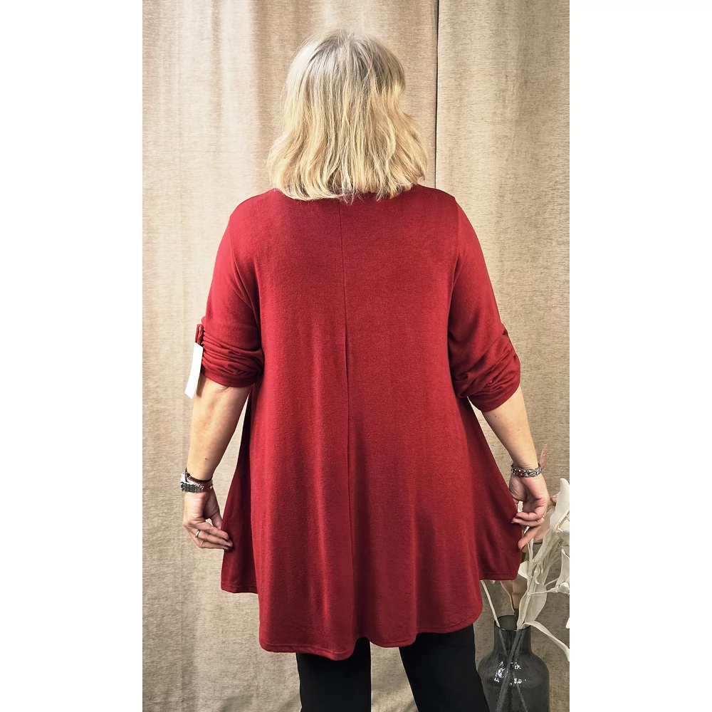 Kerekített nyakmegoldású, hosszú ujjas, de felgombolható (roll up) stílusban is viselhető, A- vonalú, alja ívelt megoldású.
