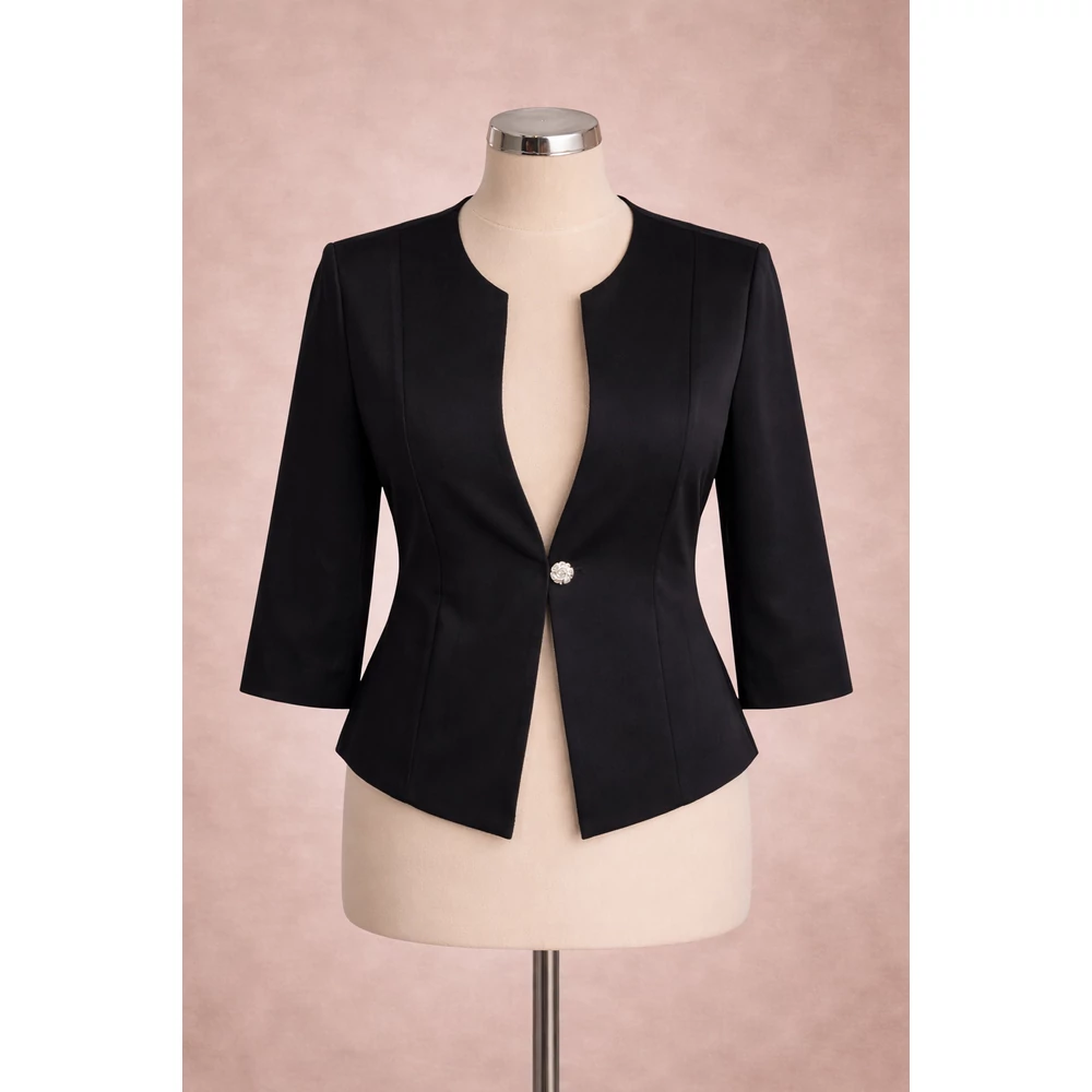 Csinosított szabásvonallal, háromnegyedes ujjakkal, elején dekoratív díszgombbal és váltöméssel.