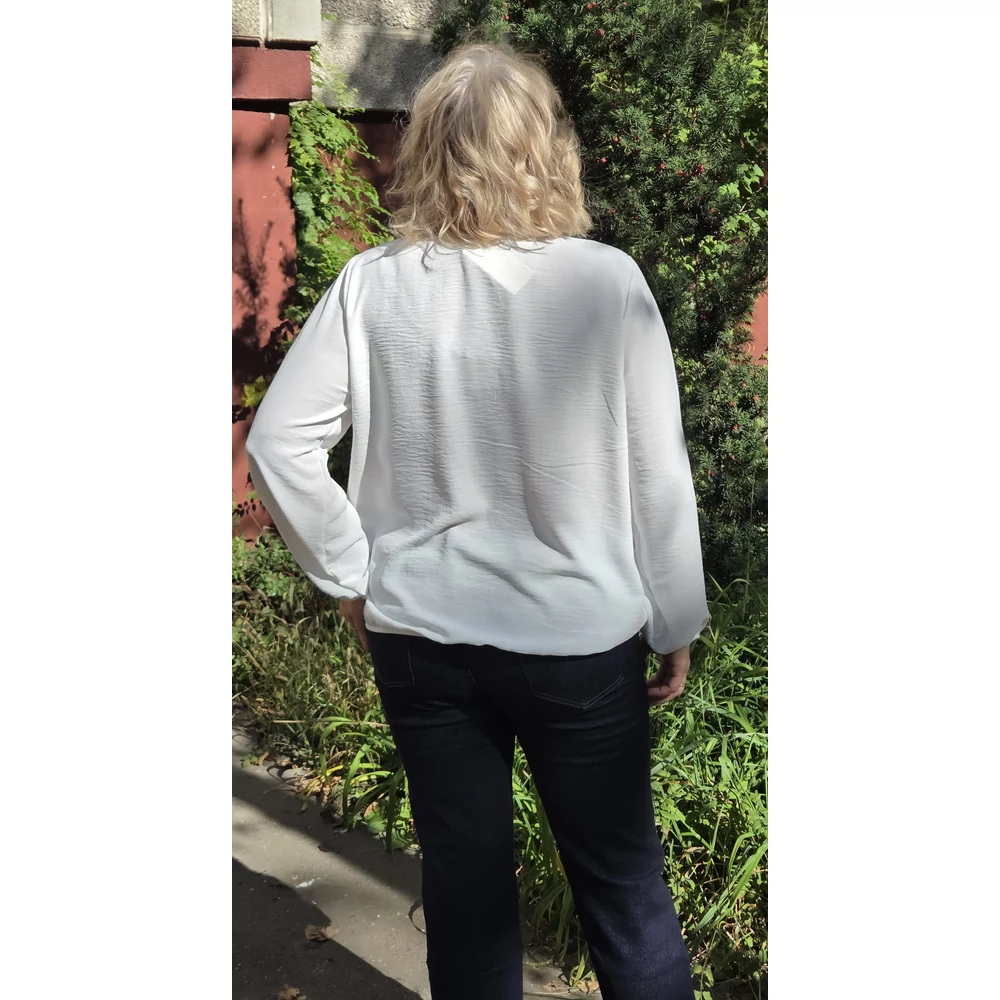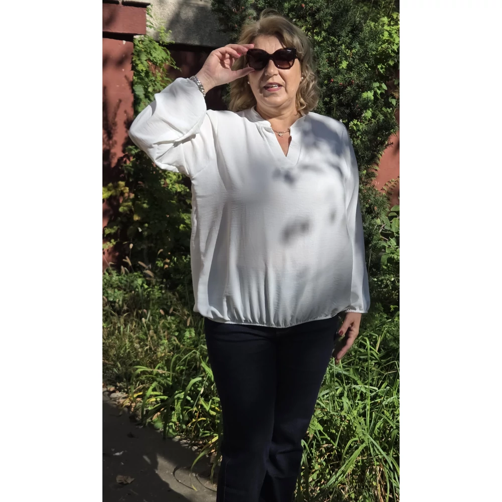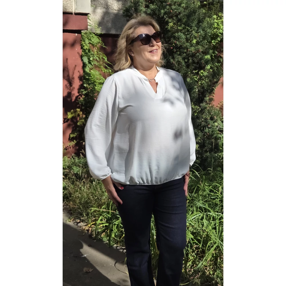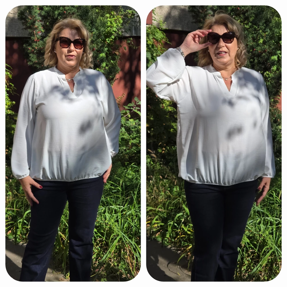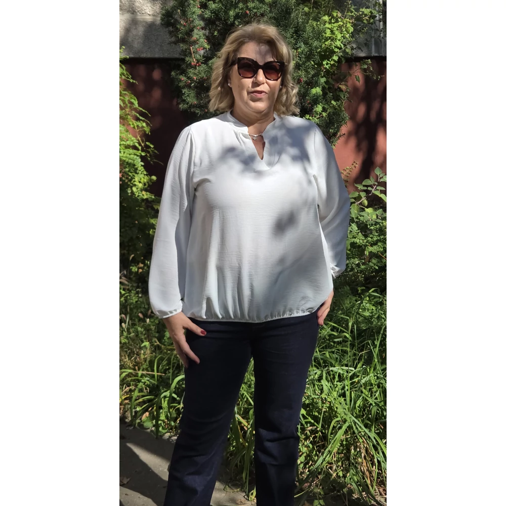 Diszkrét "V" nyakú, álló mini galléros, hosszú ujjas gumis végződéssel, alja körbe gumival húzott megoldást kapott, ami diszkréten takarja a pocakot.