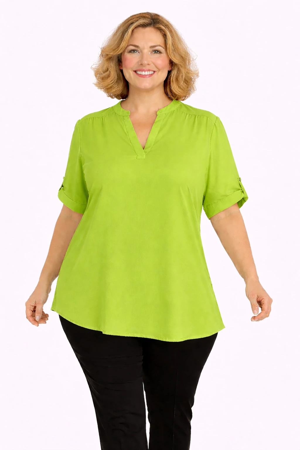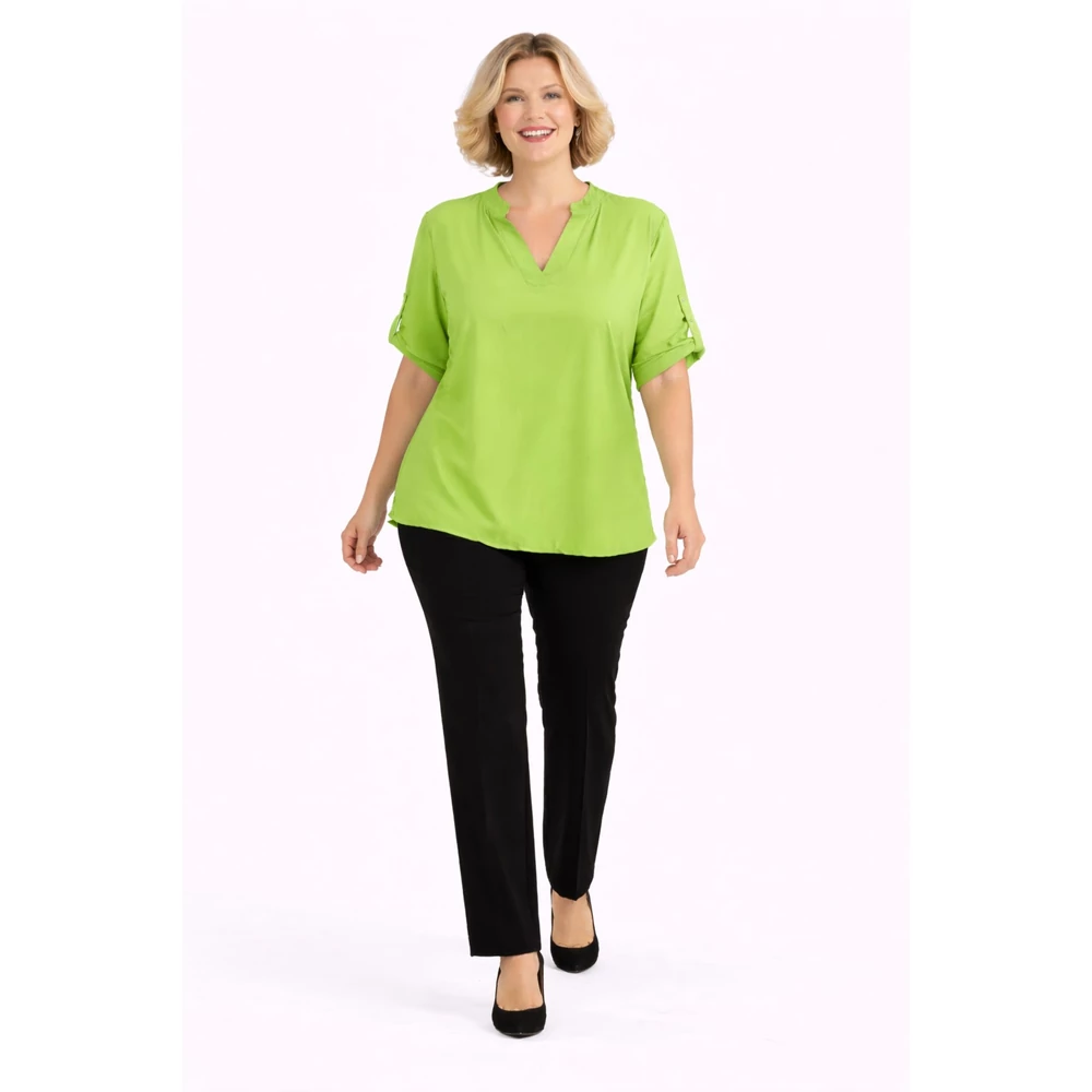 V-nyakkivágású, így csinosítja az alakot. Felgombolható rövid ujja van.