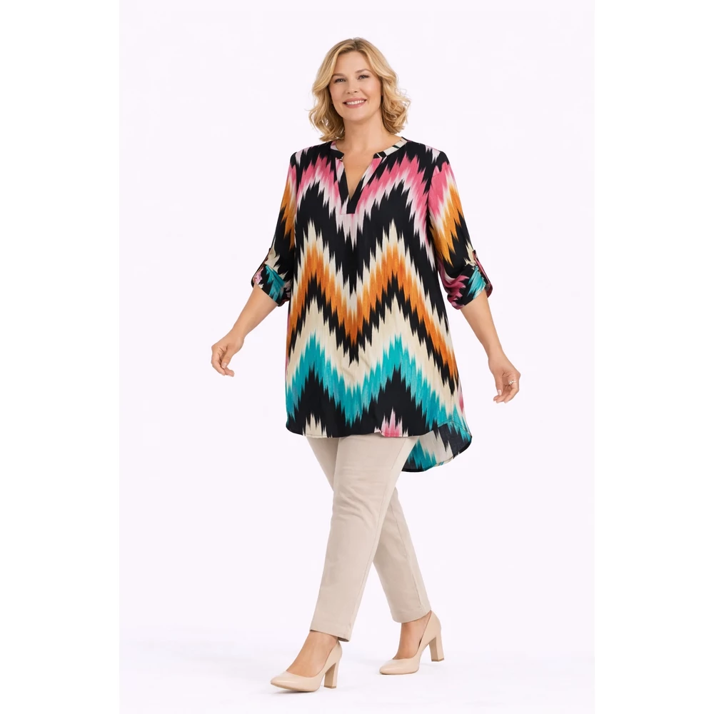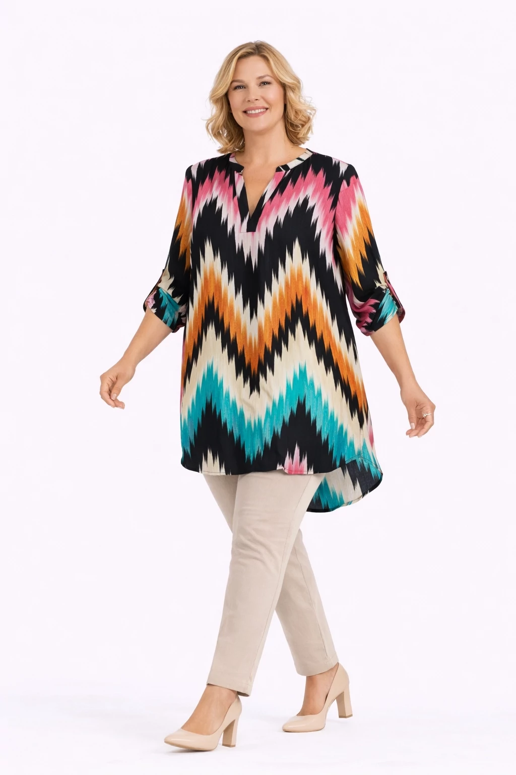 Álló galléros,nyaka V kivágással előnyösen nyújtja az alakot. Ujja könyék alá érő 3/4es roll up ujj.