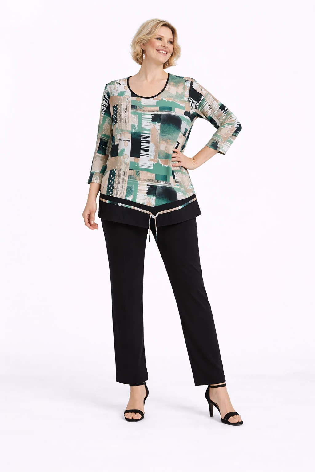 Lágyesésű, egyenes szabású. Vasalást nem igénylő viszkóz anyag.