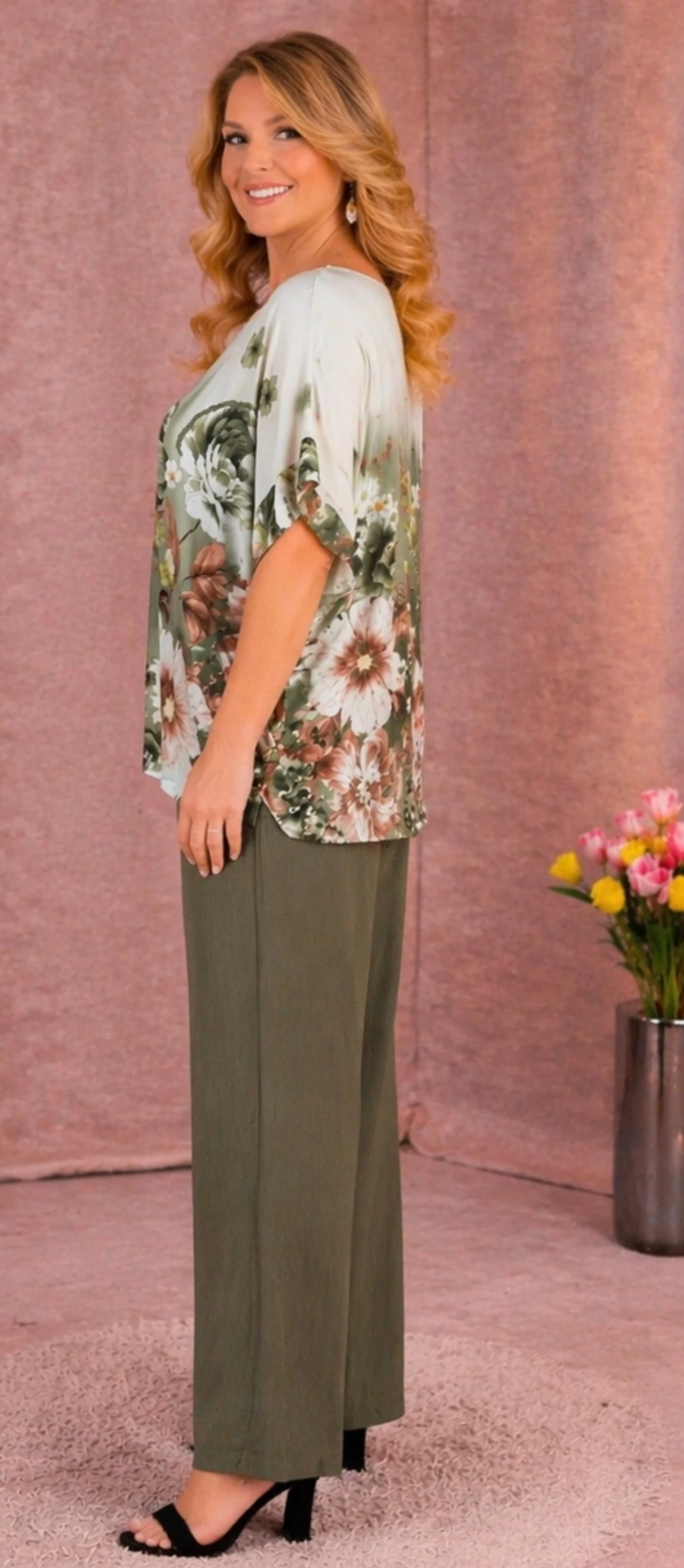 Kerekített nyakmegoldású, rövid raglán ujjú, színátmenetes - ombre hatású, virág mintás feslő.