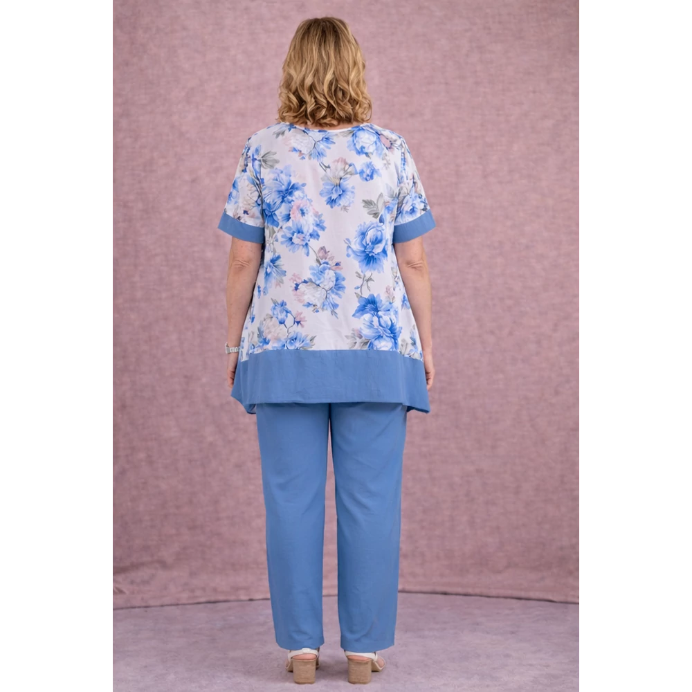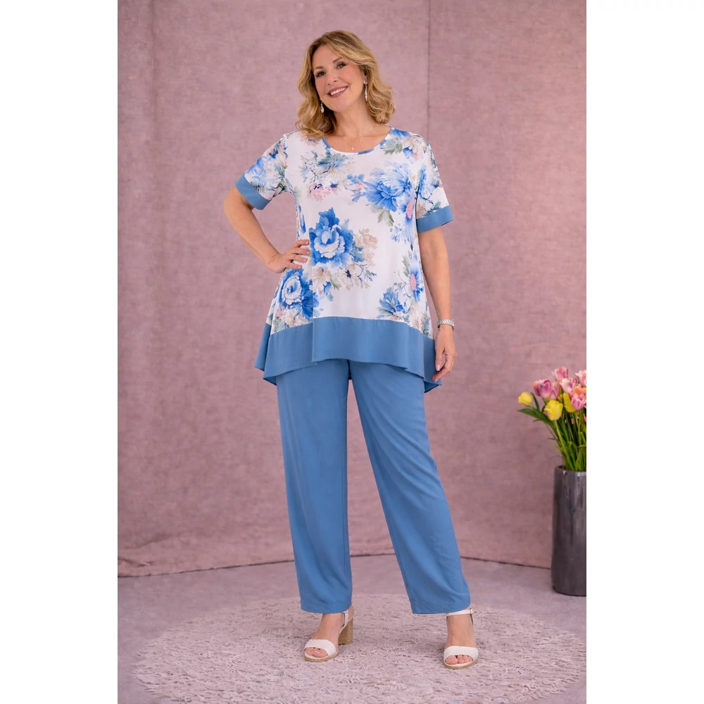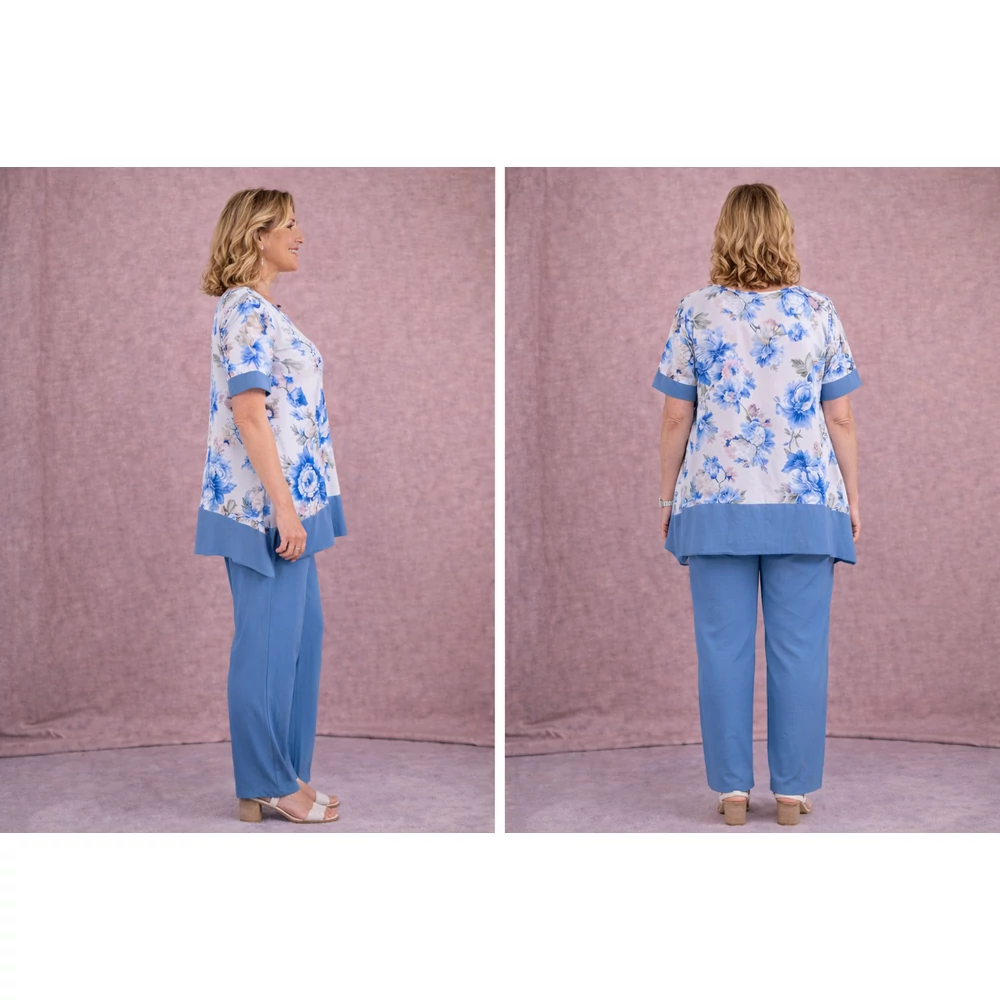 Kerekített nyakmegoldású, rövid raglán ujjú melyen a nadrággal megegyező színű, 4 centis díszpasszé, A-vonalú, oldalain diszkréz slicceléssel és szintén a nadrág színével megegyező 11 centis passzé.