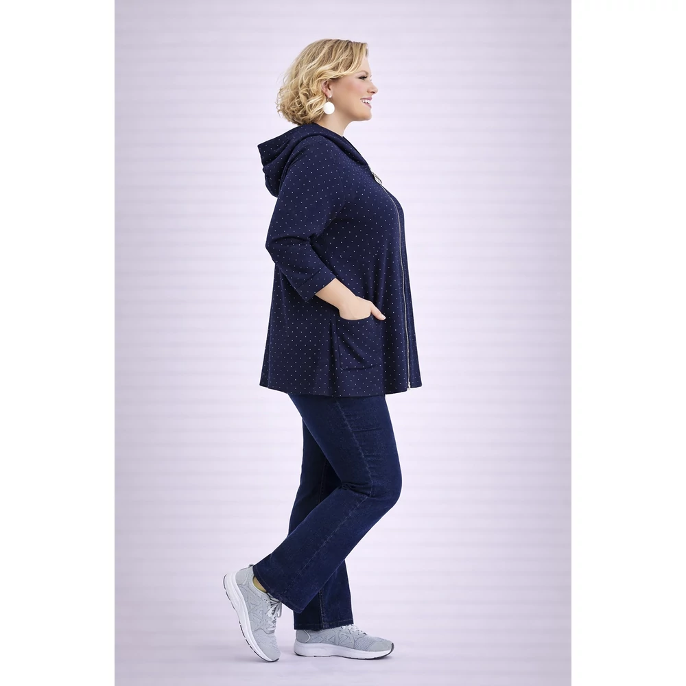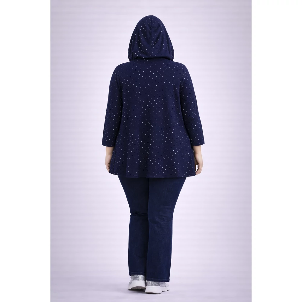 Elején cipzáras, csillogó strasszkövek sokaságával van tele elején, a hátulján és a kapucniján is.