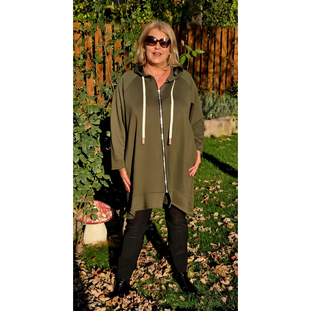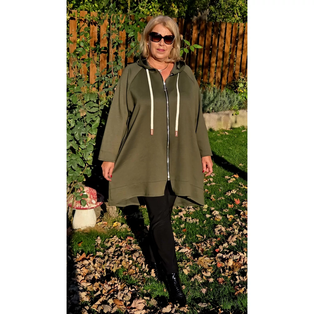 Elöl végig cipzáras, hosszított fazonú, oldalt zsebes, kapucnis melyben divatos bézs színű, bőrrel dekorált behúzóval.