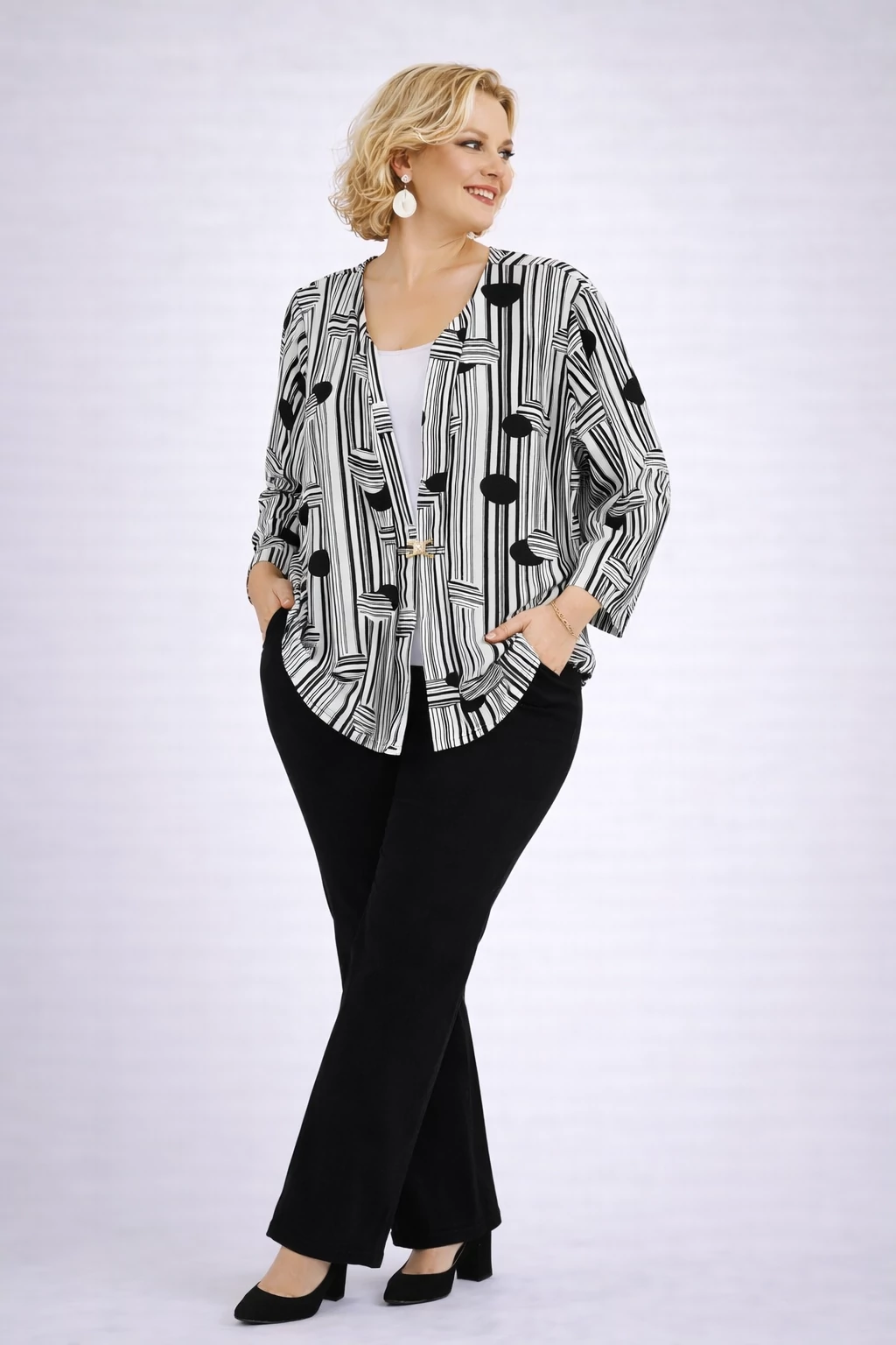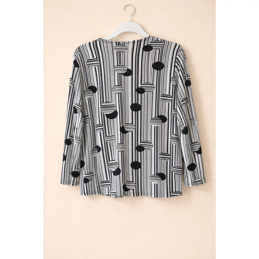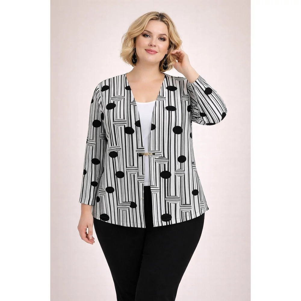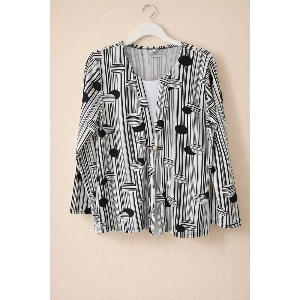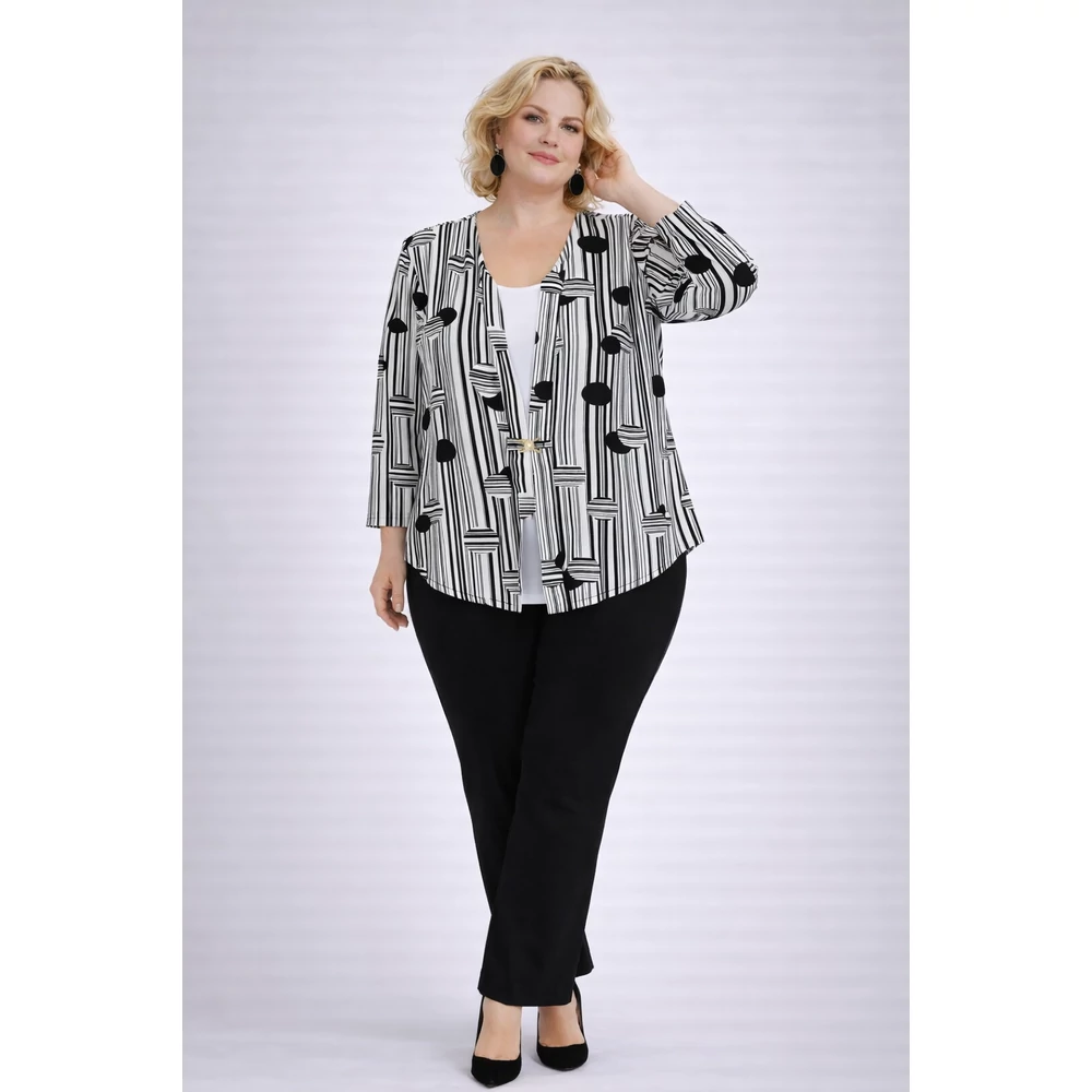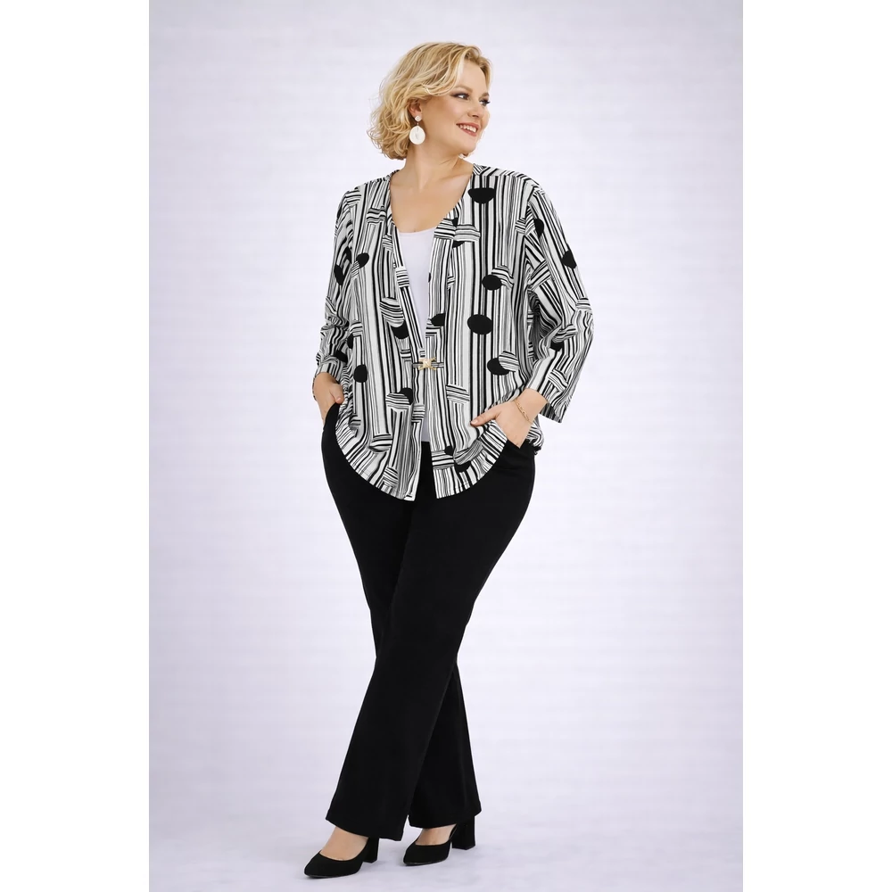 A klasszikus fekete-fehér szín összeállítású, rugalmas viszkózból készült blézer hatású csinos felső.