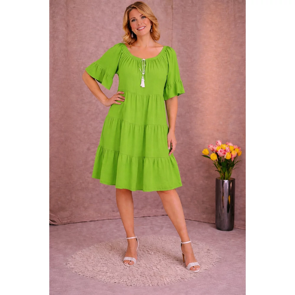 Lágy esésű, kellemes viseletű, organikus viszkóz anyagból készül 4 fodor részből álló csinos nyári egyberiha.