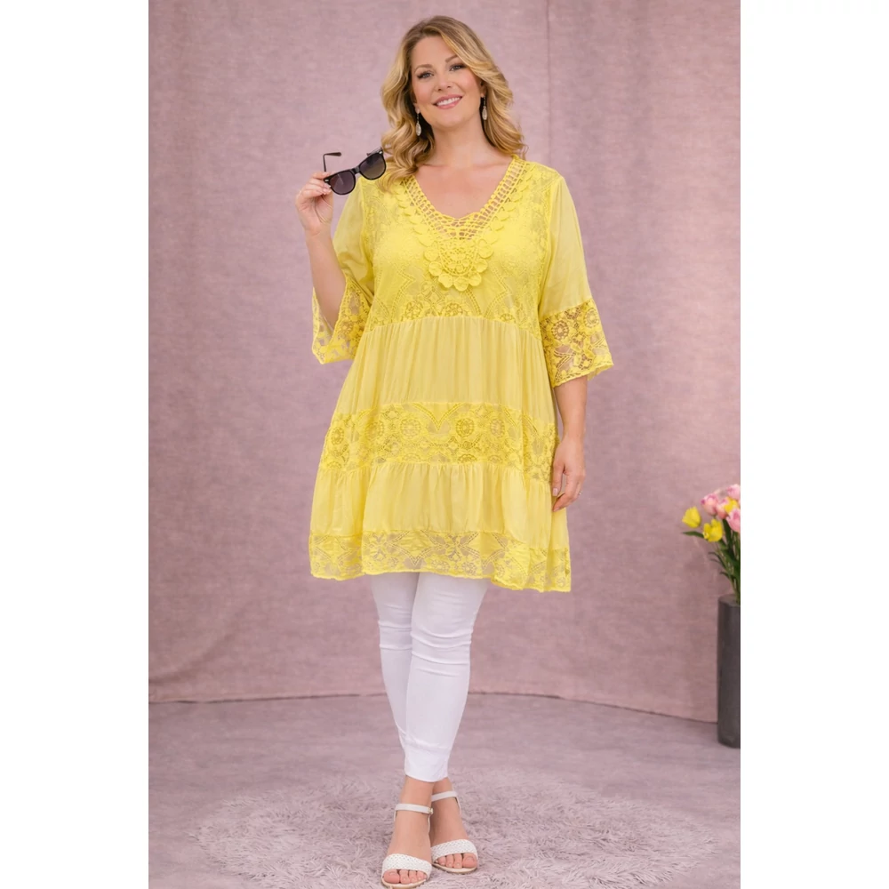 Exkluzív megjelenést adó diszkrét virágmintás cérna csipke és horgolt madeira berakású elegáns tunika.