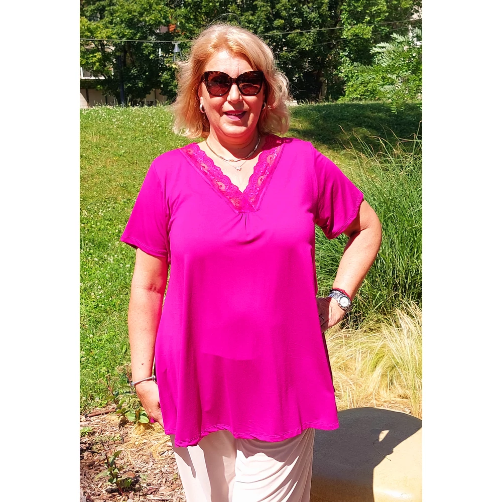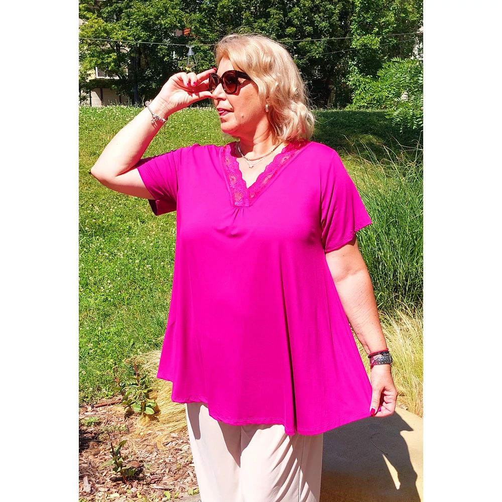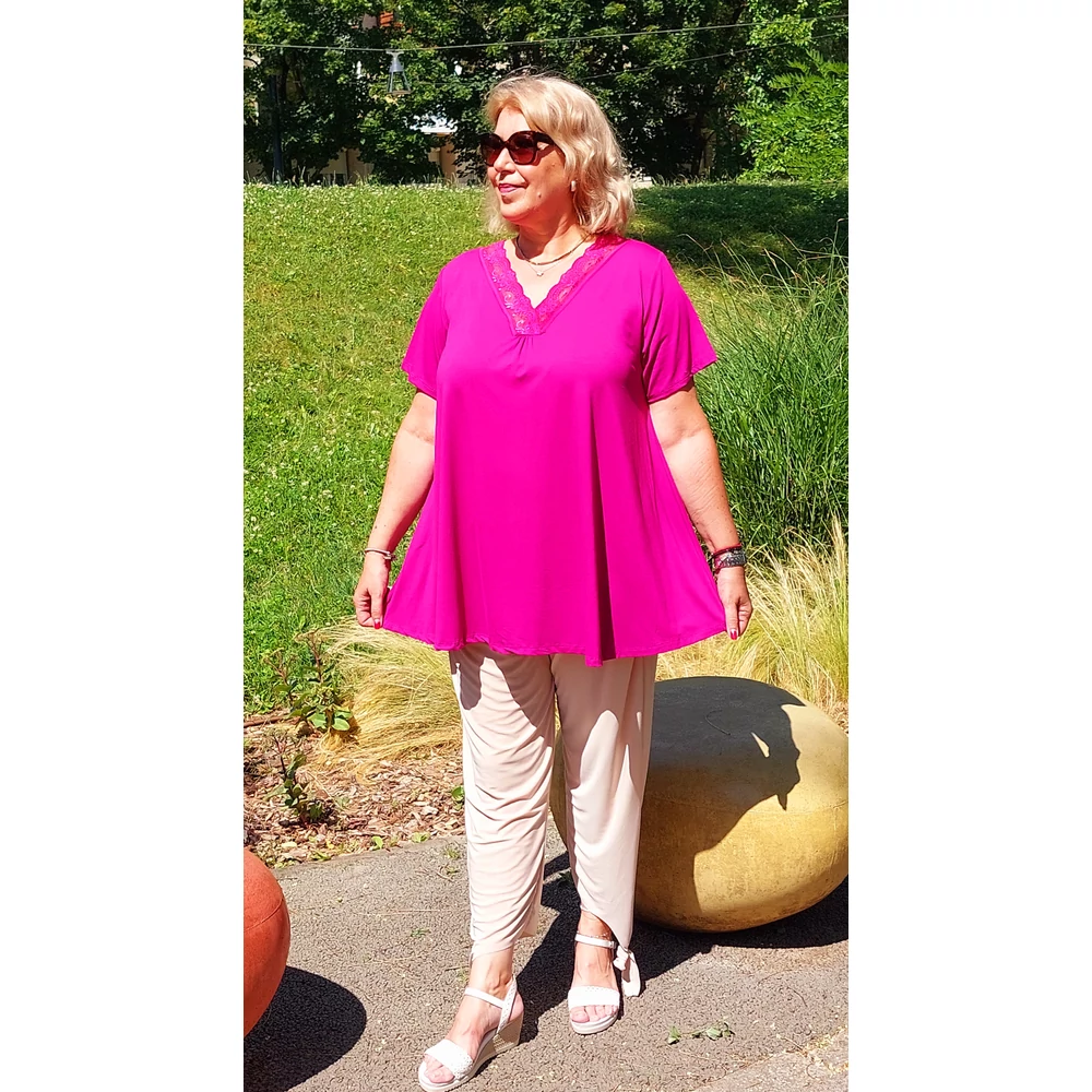 Elasztikus pamut anyagból készült V-nyakánál, diszkérét kis ráncolással, színében megegyező 5 cm.-es csipke díszítéssel, A vonalú, rövid ujjú felső.