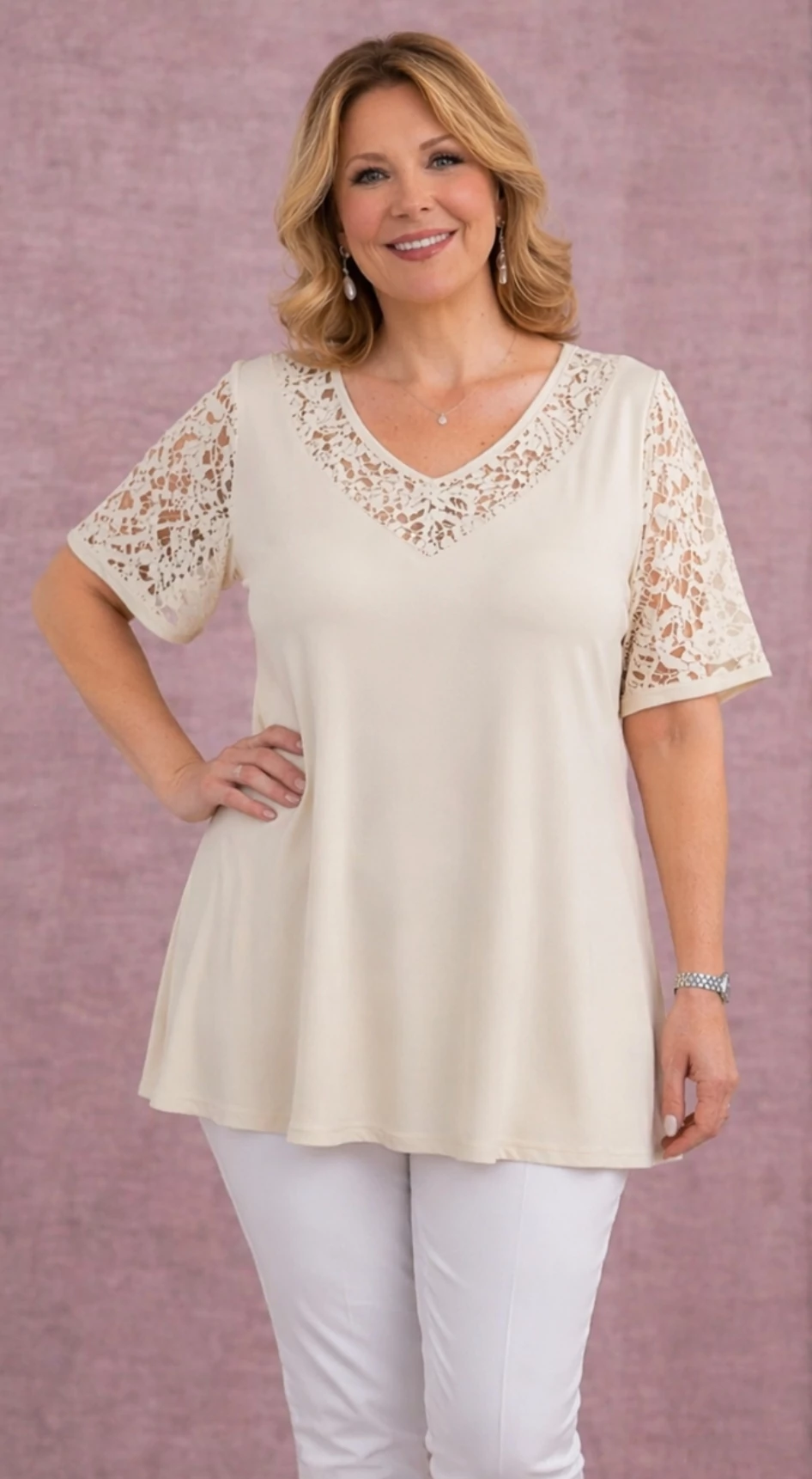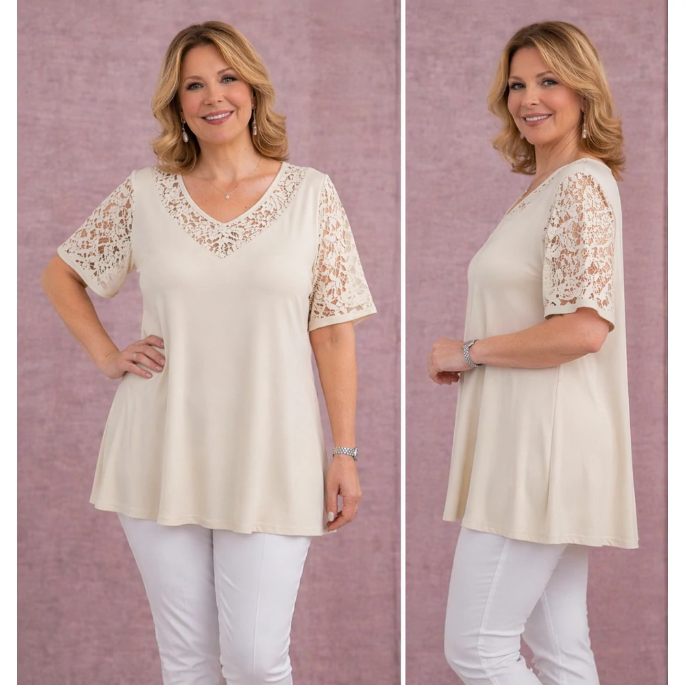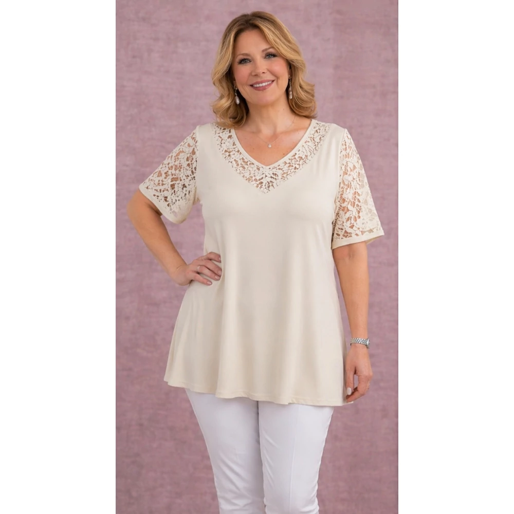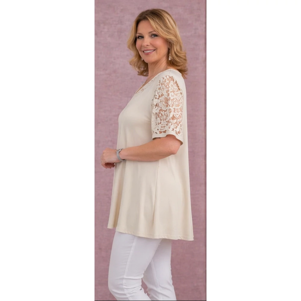 Csipkés ujjú, V-csipke nyakas tunika -BÉZS- 50-60 méret