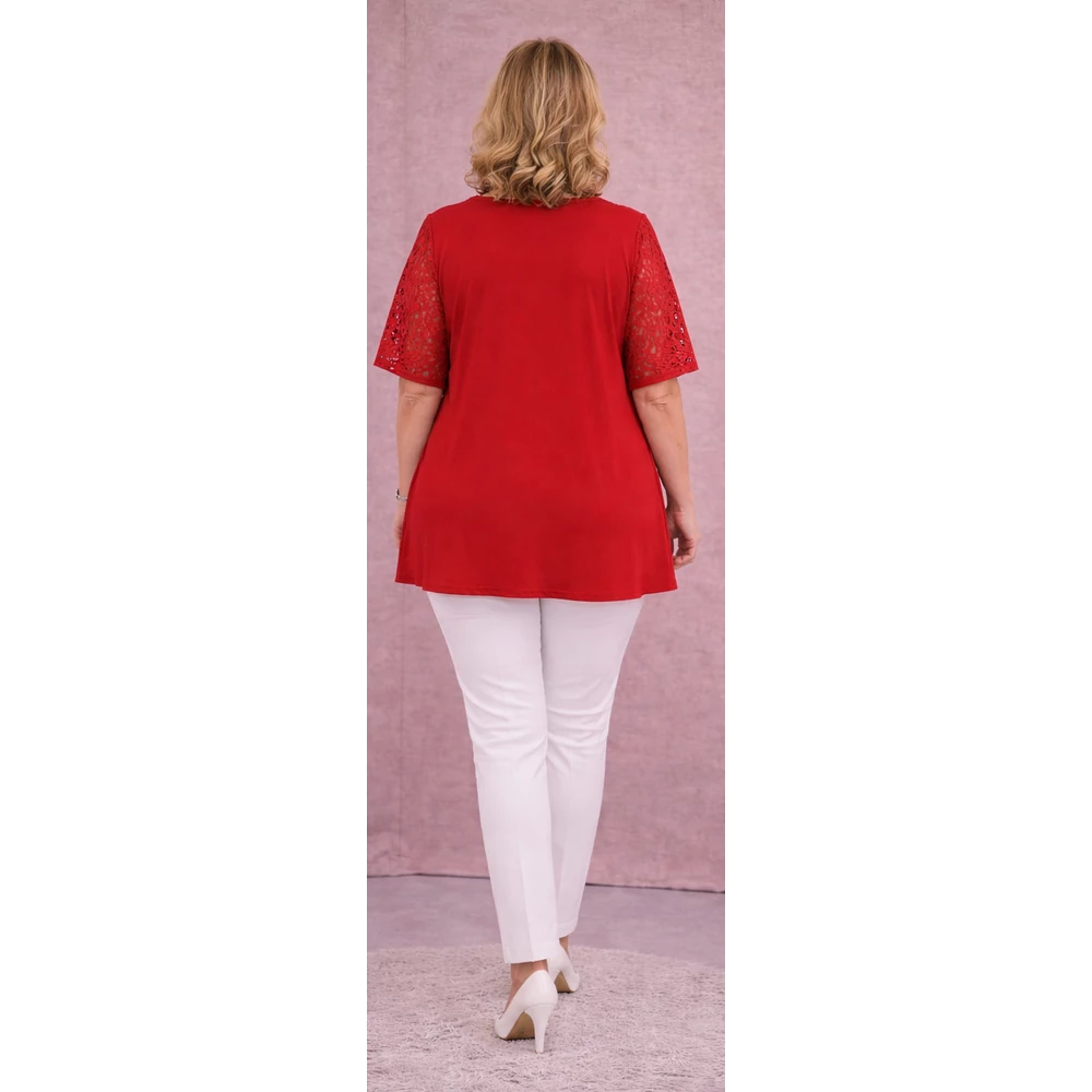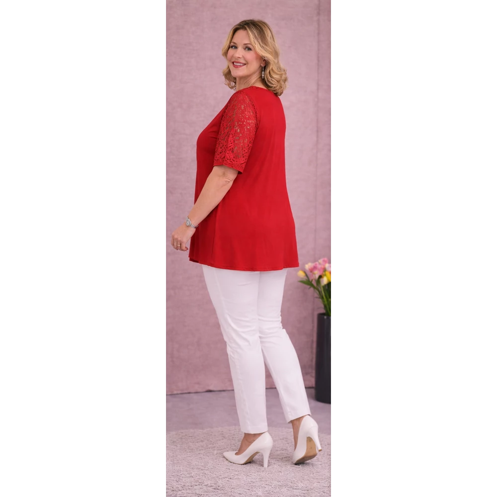 Dekoltázsnál gondosan kidolgozott csipkeberakás található, amely a tekintetet szinte oda vonza. Ugyanez a csipke minta köszön vissza az ujjain is, ezzel téve igazán különlegessé.