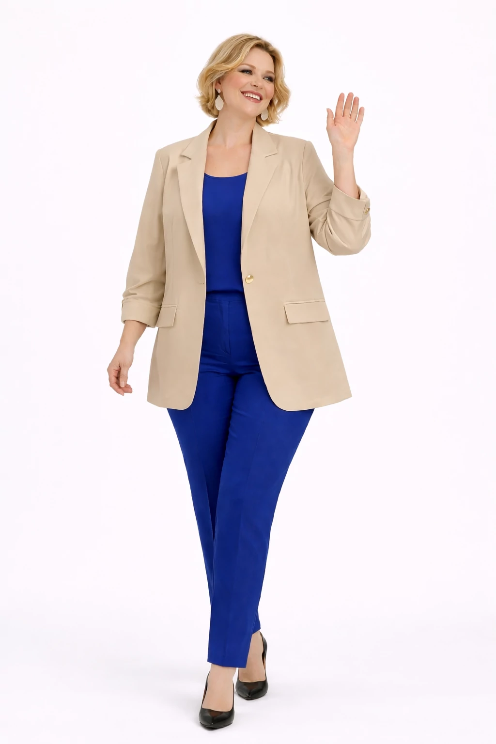 Ujja roll-up ujjként is felhajtható, de akár le is hajtható, így hosszú ujjú blézerként is tökéletes megjelenést ad.