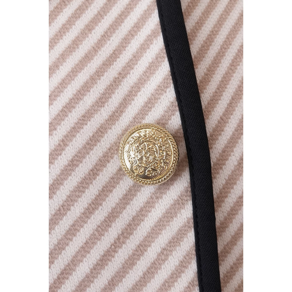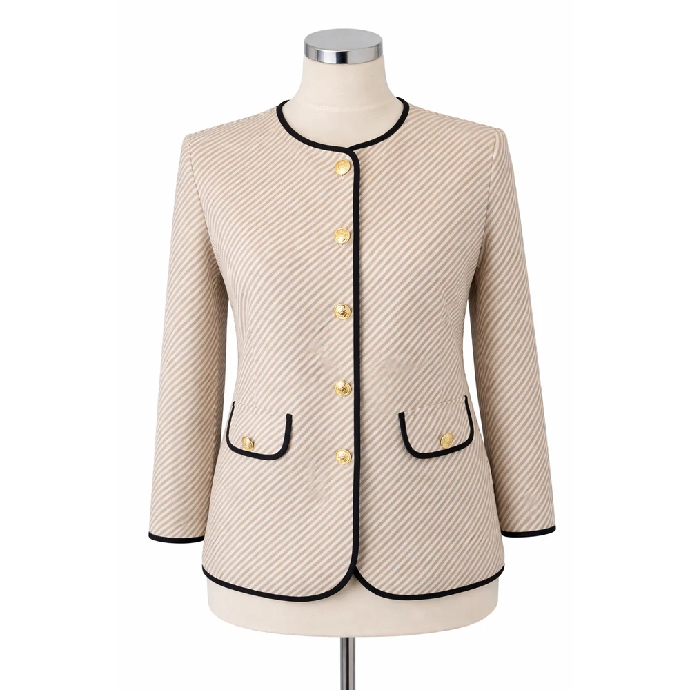 Kerekített nyakkivágású, hosszú ujjú, egyenes szabású alkalmi blézer,amely előnyösen takarja a popsit is.