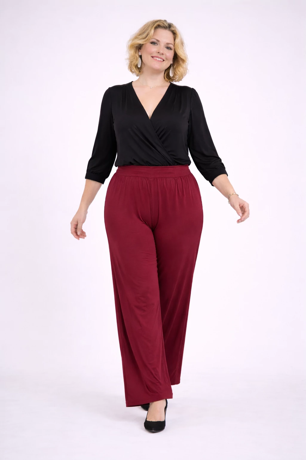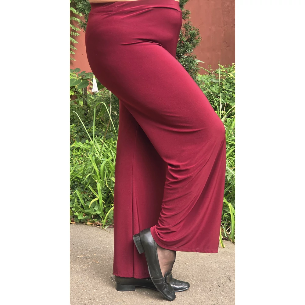 Vékony, szellős, elasztikus organikus viszkóz jellegű anyagból készült, gumis derekú, bő szárú (TRAPÉZ) nadrág.