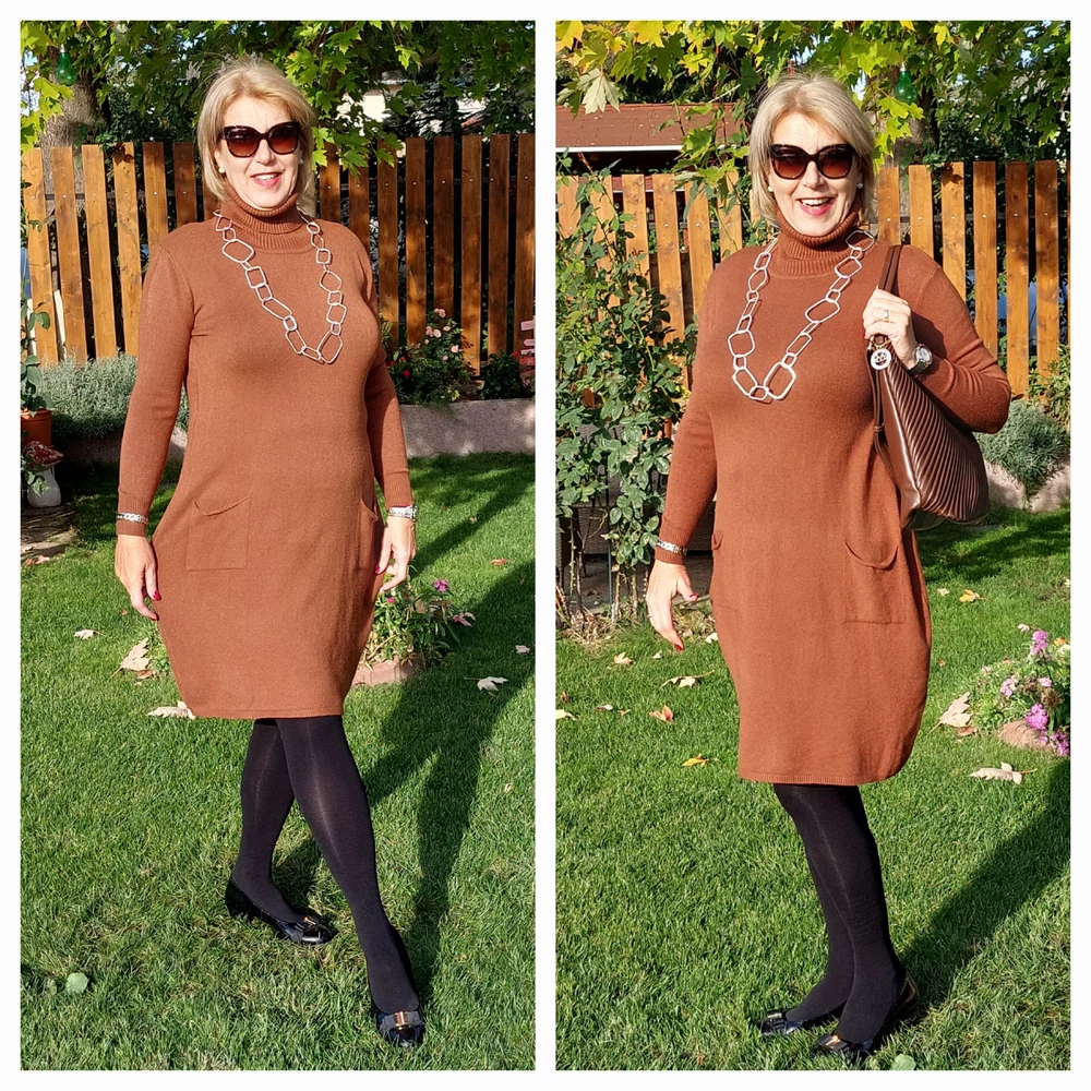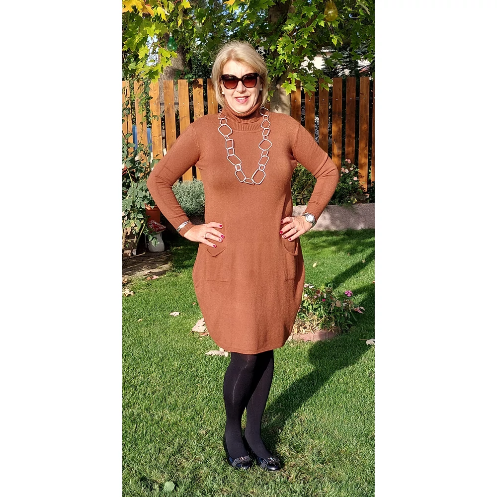 Pihe-puha, kellemes meleg hatású, gépi kötött anyagból készült, enyhén hagyma fazonú, elöl zsebes, garbós egyberuha.