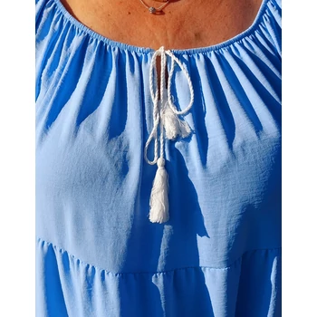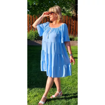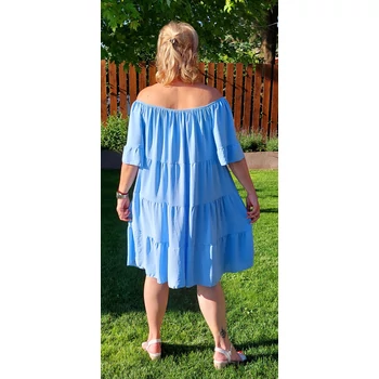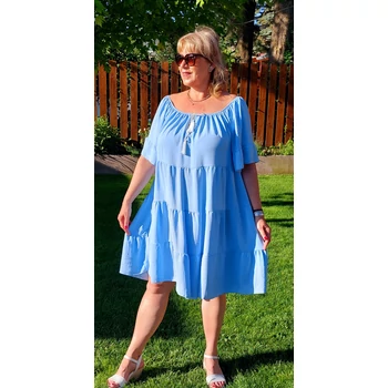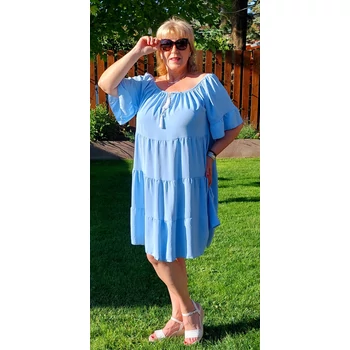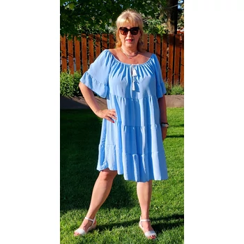 Lágy esésű, kellemes viseletű, organikus viszkóz anyagból készül 4 fodor részből álló csinos nyári egyberiha. Gumis carmen nyakmegoldású, mely akár vállra lehúzva is viselhető, diszkrét kis V kivágással és divatos megkötővel, A vonalú, 4 fodor részből áll. Könyékig érő ujjai végén is fodor díszítés. Hossza: 100 cm. Magas minőségű, enyhe vasalást igénylő, Olaszországból származó, egyméretes termékünk. 46,48,50,52 és 54-es méretet viselő Hölgy vevőinknek ajánlom! |