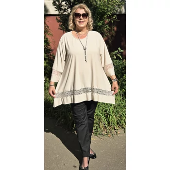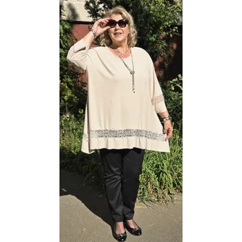 Sokak által kedvelt, különleges, lágy esésű, kellemes viseletű, kender kristály anyagból készült elegáns blúz, színében megegyező csipkével dekorált. Kimonó jellegű ujjain és alján, betét dekorációs megoldással fut körbe a csipke dekoráció. Enyhén csónak nyakmegoldású, A vonalú szabást kapott. Elegáns nyaklánccal kiegészítve, dekoratív megjelenést adó örök darabja lehet ruhatárának. Mell: 140 cm. Csípő: 176 cm. Hossza: 87 cm. Magas minőségű, vasalást nem igénylő, egyméretes termékünk Olaszországból érkezett. A fotón látható nyaklánc, csak ötletet adó kiegészítő. Ajánlom 48,50,52 és 54-es méretet viselő Hölgy vevőinknek. |
