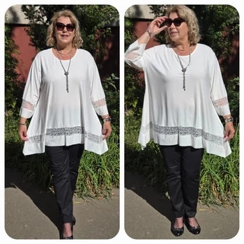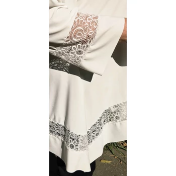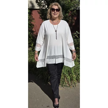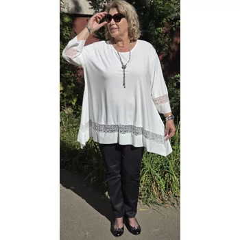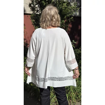 Sokak által kedvelt, különleges, lágy esésű, kellemes viseletű, kender kristály anyagból készült elegáns blúz, színében megegyező csipkével dekorált. Kimonó jellegű ujjain és alján, betét dekorációs megoldással fut körbe a csipke dekoráció. Enyhén csónak nyakmegoldású, A vonalú szabást kapott. Elegáns nyaklánccal kiegészítve, dekoratív megjelenést adó örök darabja lehet ruhatárának. Mell: 140 cm. Csípő: 176 cm. Hossza: 87 cm. Magas minőségű, vasalást nem igénylő, egyméretes termékünk Olaszországból érkezett. A fotón látható nyaklánc, csak ötletet adó kiegészítő. Ajánlom 48,50,52 és 54-es méretet viselő Hölgy vevőinknek. |