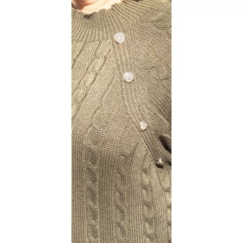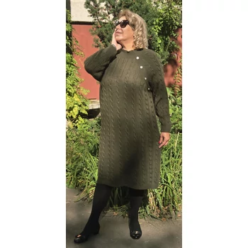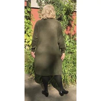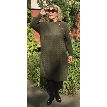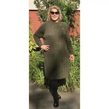 Kellemes viseletű, szellős, pamut fonálból, gépi kötött eljárással készült egyberuhánk Olaszországból származó termékünk. Fél garbó nyakmegoldást kapott, elején és ujjain divatos fonott minta fut végig, bal oldalt shréhen 4 db. apró arany gomb díszítéssel. Ejtett vállú, hosszú ujjas, egyenes szabásvonalú. Viselheted szűk szárú nadrággal, bőr legginggss-el vagy vastagabb harisnyával ezt a divatos MIDI hosszúságú ruhát. Hossz. 117 cm. Mell: 130 cm. Csípő: 130 cm. Ez a nívós minőségű termékünk egyméretes, ajánlom 48,50,52,54 és 56-os méretet viselő Hölgy vevőinknek. |