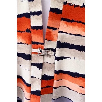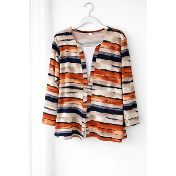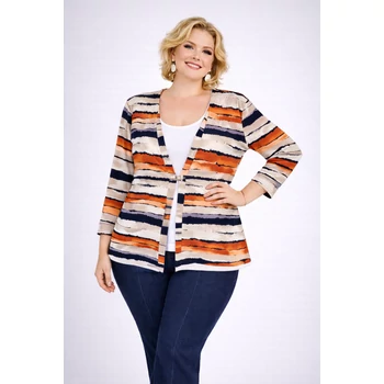 Harmonikus szín összeállítású, rugalmas viszkózból készült blézer hatású csinos felső. Elöl elegánssá egy díszcsat teszi.Hosszú ujjal rendelkezik. Elején egy fehér trikó betétet kapott. Ideális választás bármilyen alkalomra, ahol kicsit elegánsabban kell megjelenni. Hossza: 70 cm. |