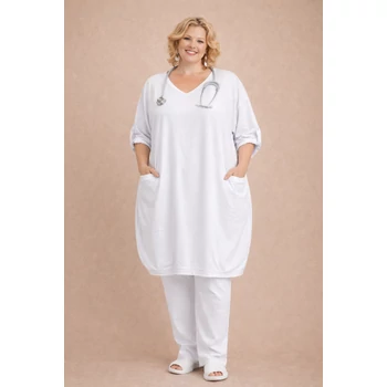 Egészségügyben dolgozóknak kiváló választás! Magas minőségű, vékonyabb, elasztikus pamut anyagból készült sportos tunika. V-nyakmegoldású, ejtett vállú, hosszú ujjas, de roll up stílusban felgombolható, hagyma fazonú, elöl 2 bedugós zsebbel, alján hozzávarrt 30 centis toldással. Hossza: 90 cm. Mell: 150 cm. Csípő: 160 cm. Olaszországból érkezett, ez az enyhe vasalást igénylő sportos megjelenést adó, egyméretes tunikánk. 50,52,54 és 56-os méretet viselő Hölgy vevőinknek ajánlom. |