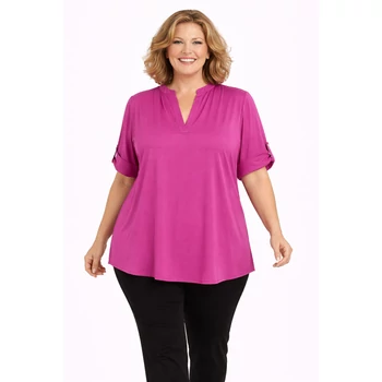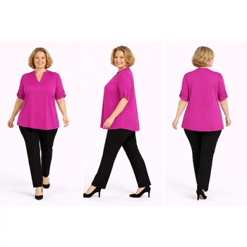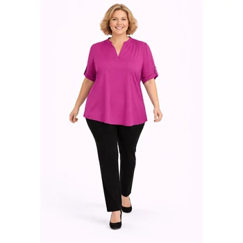 Jégselyem anyagból készült igazán elegáns megjelenésű álló galléros blúz. V-nyakkivágású, így csinosítja az alakot. Felgombolható rövid ujja van. Akár alkalmi nadrággal akár farmerral tökéletes választás lehet. Hossz: 70 cm. Egyméretes Olaszországból származó termékünk. 48, 50, 52, 54-es méretet viselő Hölgyeknek ajánlom. |