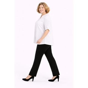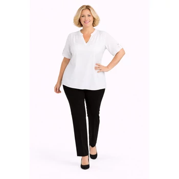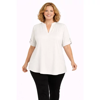 Jégselyem anyagból készült igazán elegáns megjelenésű álló galléros blúz. V-nyakkivágású, így csinosítja az alakot. Felgombolható rövid ujja van. Akár alkalmi nadrággal akár farmerral tökéletes választás lehet. Hossz: 70 cm. Egyméretes Olaszországból származó termékünk. 48, 50, 52, 54-es méretet viselő Hölgyeknek ajánlom. |