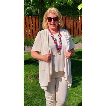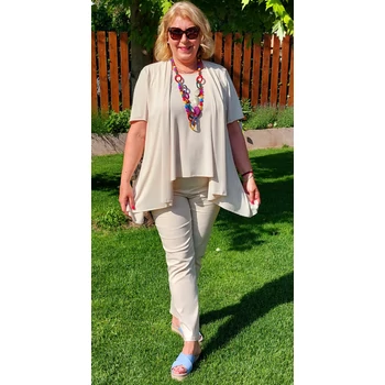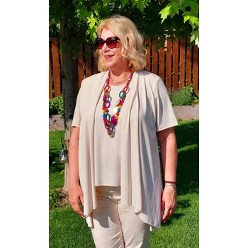 Alkalmi, elegáns megjelenést adó NYÁRI felsőn megérkezett a készletünkbe. Lágy esésű, kellemes viseletű, gyöngyvászon anyagból készült, kettő az egyben hatást adó felső. Kerekített nyakú trikó jellegű alsó, sálgalléros blézer hatású felsővel, összevarrt megoldással, rövid ujjakkal. A trikó egyenes szabásvonalú, viszont a rávarrt felső rész A vonalú szabást kapott. A trikó hossza: 70 cm. A blézer hossza: 78 cm. Mell: 82 cm Csípő: 90 cm. Ujj: 20 cm. Magas minőségű, vasalást nem igénylő, egyméretes termékünk Olaszországból érkezett. Ajánlom 48,50,52,54 és 56-os méretet viselő Hölgy vevőinknek. |