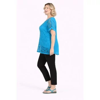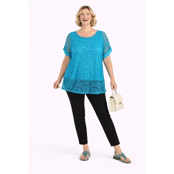 Álomszép csupa csipke blúz, egybevarrt pamut alsó trikóval. Hátulja színével egyező, lágy esésű muszlin anyag. Alatta pocakot takaró, elasztikus trikóval rendelkezik. Kerek nyakú, ejtett vállú. Ujján muszlin betét kapott helyett. Egyméretes minőségi Olaszországból származó termékünk, melyet 50-56 méretig ajánljuk. |