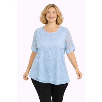 Álomszép csupa csipke blúz, egybevarrt pamut alsó trikóval. Hátulja színével egyező, lágy esésű muszlin anyag. Alatta pocakot takaró, elasztikus trikóval rendelkezik. Kerek nyakú, ejtett vállú. Ujján muszlin betét kapott helyett. Egyméretes minőségi Olaszországból származó termékünk, melyet 50-56 méretig ajánljuk. |