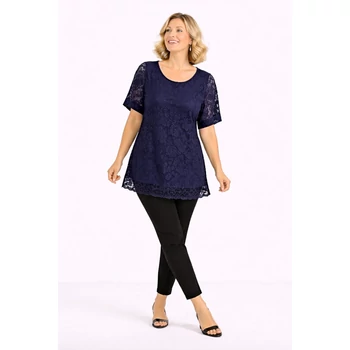 Álomszép csupa csipke blúz, egybevarrt pamut alsó trikóval. Hátulja színével egyező, lágy esésű muszlin anyag. Alatta pocakot takaró, elasztikus trikóval rendelkezik. Kerek nyakú, ejtett vállú. Ujján muszlin betét kapott helyett. Egyméretes minőségi Olaszországból származó termékünk, melyet 50-56 méretig ajánljuk. |
