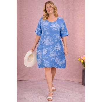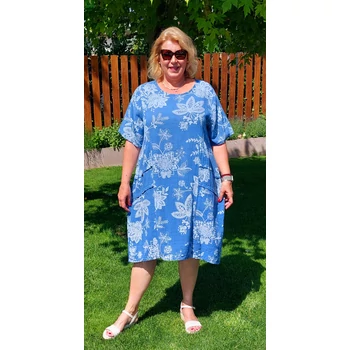 Szellős, kellemes viseletű, vékony lenvászon anyagból készült kánikula ruha hibiszkusz jellegű virágok sokaságával. Kerekített nyakmegoldású,egyenes szabásvonalú, rövid ujjas, mell alatti részen húzott megoldással rátétekkel. Hossza: 112 cm. Ujja: 46 cm Csípő: 154 cm. Magas minőségű, enyhe vasalást igénylő, egyméretes termékünk Olaszországból. Ajánlom 48,50 és 52-es méretet viselő Hölgy Vevőinknek. |