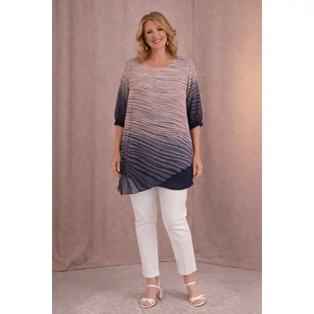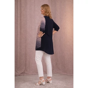 Sötétkék- púder átmenetes,ombre hatású , arany pöttyös muszlin rátétes blúz, mely átlapolt megoldással a bal oldalra ferdén szabott. Háta egyszínű sötétkék. Nyaka kerek, hosszú ujja mintás muszlin, sötétkék, keskeny passzéval. Szabásvonala egyenes, háta egyszínű. Alja az anyag eldolgozása következtében fodros hatást kelt. Elasztikus viszkóz, mely vasalást nem igényel. Hossza : 80 cm. |