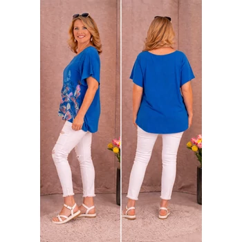 Kellemes viseletű, lenge, géz anyagból készült, csipke berakással variált csinos nyári felső. Anyagában megegyező, elasztikus, virág mintás, váll részénél berakott csipke betéttel. A blúz alján vidám, színes, repkedő pillangók sokaságával. Kerekített nyakmegoldású, A- vonalú, rövid ujjú. Hossza: 80 cm. Magas minőségű, Olaszországból származó, enyhe vasalást igénylő, egyméretes termékünk. Ajánljuk 46,48,50 és 52-es méretet viselő Vevőinknek! |