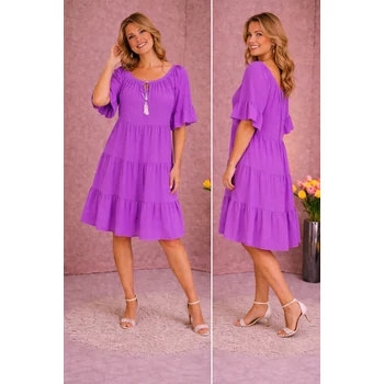 Lágy esésű, kellemes viseletű, organikus viszkóz anyagból készül 4 fodor részből álló csinos nyári egyberiha. Gumis carmen nyakmegoldású, mely akár vállra lehúzva is viselhető, diszkrét kis V kivágással és divatos megkötővel, A vonalú, 4 fodor részből áll. Könyékig érő ujjai végén is fodor díszítés. Hossza: 100 cm. Magas minőségű, enyhe vasalást igénylő, Olaszországból származó, egyméretes termékünk. 46,48,50,52 és 54-es méretet viselő Hölgy vevőinknek ajánlom! |