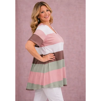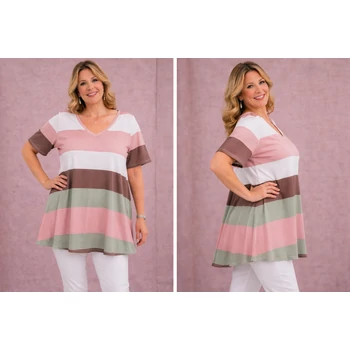 Selyempamut anyagból készült, lefelé bővülő V-nyakú felső vagy tunika. Csíkozása és lágy színei igazán nyújtja az alakot. Ujja 3/4es megoldású. Hossza: 87 cm. Magas minőségű, Olaszországból származó termék. Egyméretes termékünk, ajánlom 50, 52, 54, 56, 58, 60-as méretet viselő vevőinknek! |