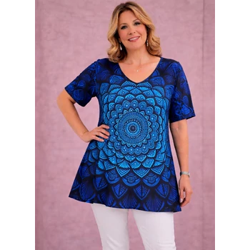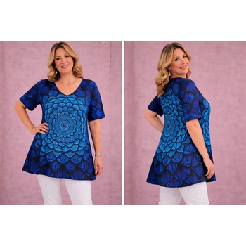 Selyempamut anyagból készült, lefelé bővülő V-nyakú felső vagy tunika. Igazi klasszikus mandala minta a kék szín rengeteg árnyalatában. Ujja 3/4es megoldású. Hossza: 87 cm. Magas minőségű, Olaszországból származó termék. Egyméretes termékünk, ajánlom 50, 52, 54, 56, 58, 60-as méretet viselő vevőinknek! |