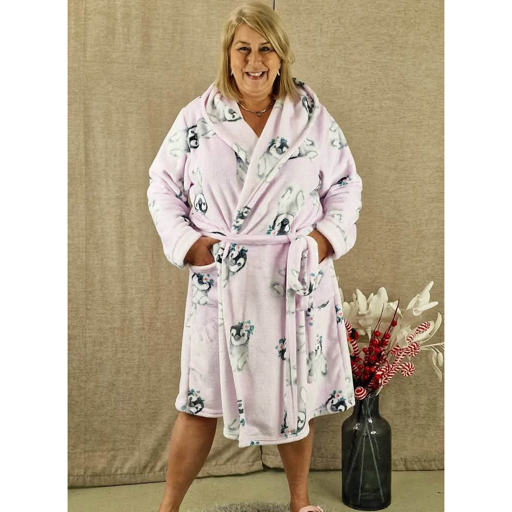 Pihe-puha, kellemes viseletű, mikroplüss anyagból készült meseszép köntös, halvány rózsaszín alap színen, bájos pingvin figurákkal.
