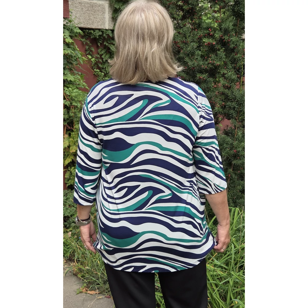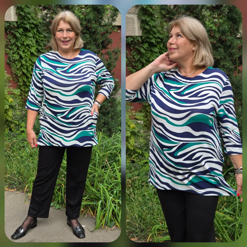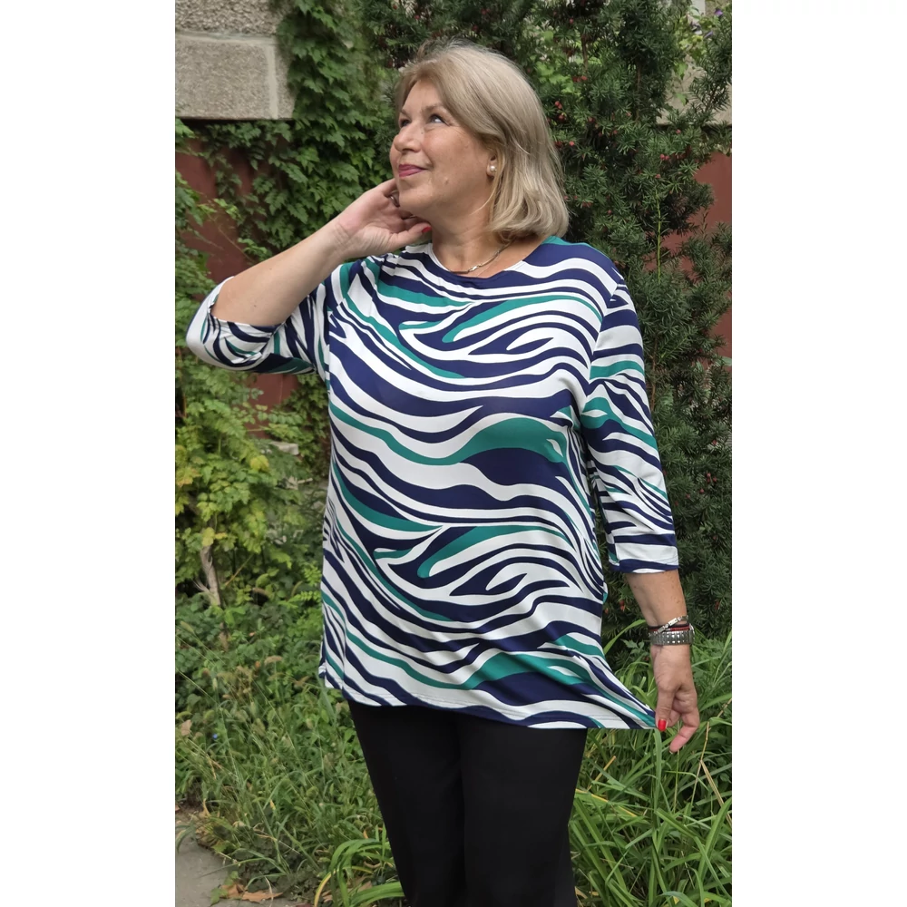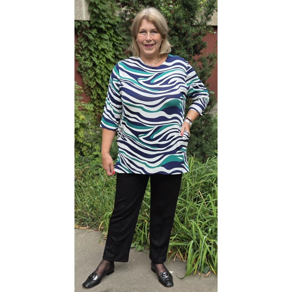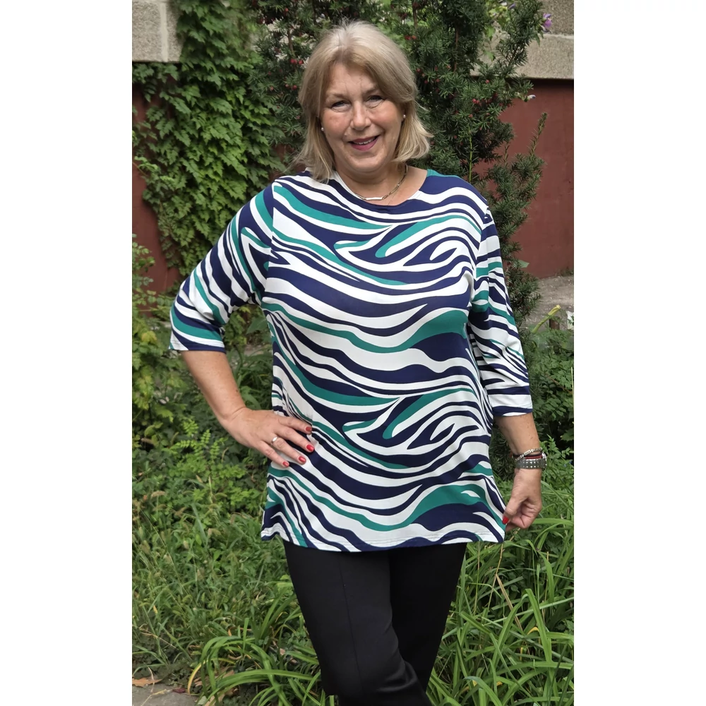 Kellemes viseletű, elasztikus pamut anyagból készült vidám, fehér alapon, sötétkék és zöld hullám mintás felső.