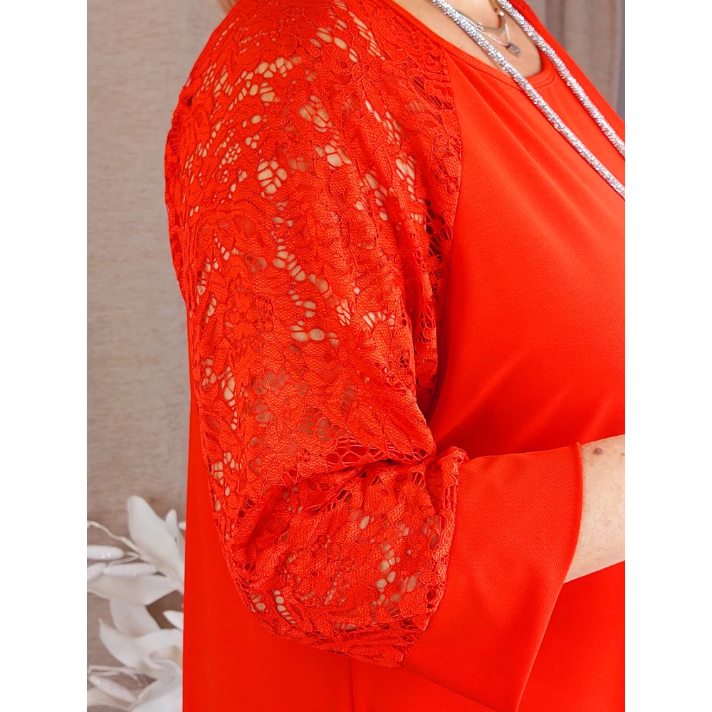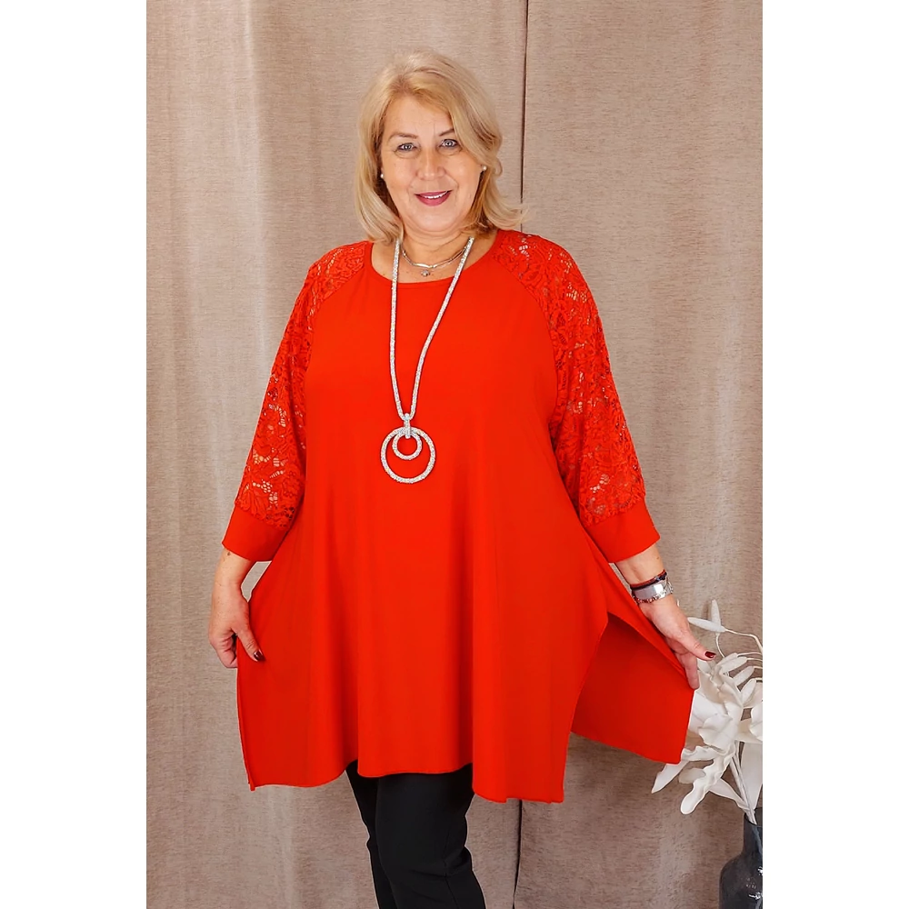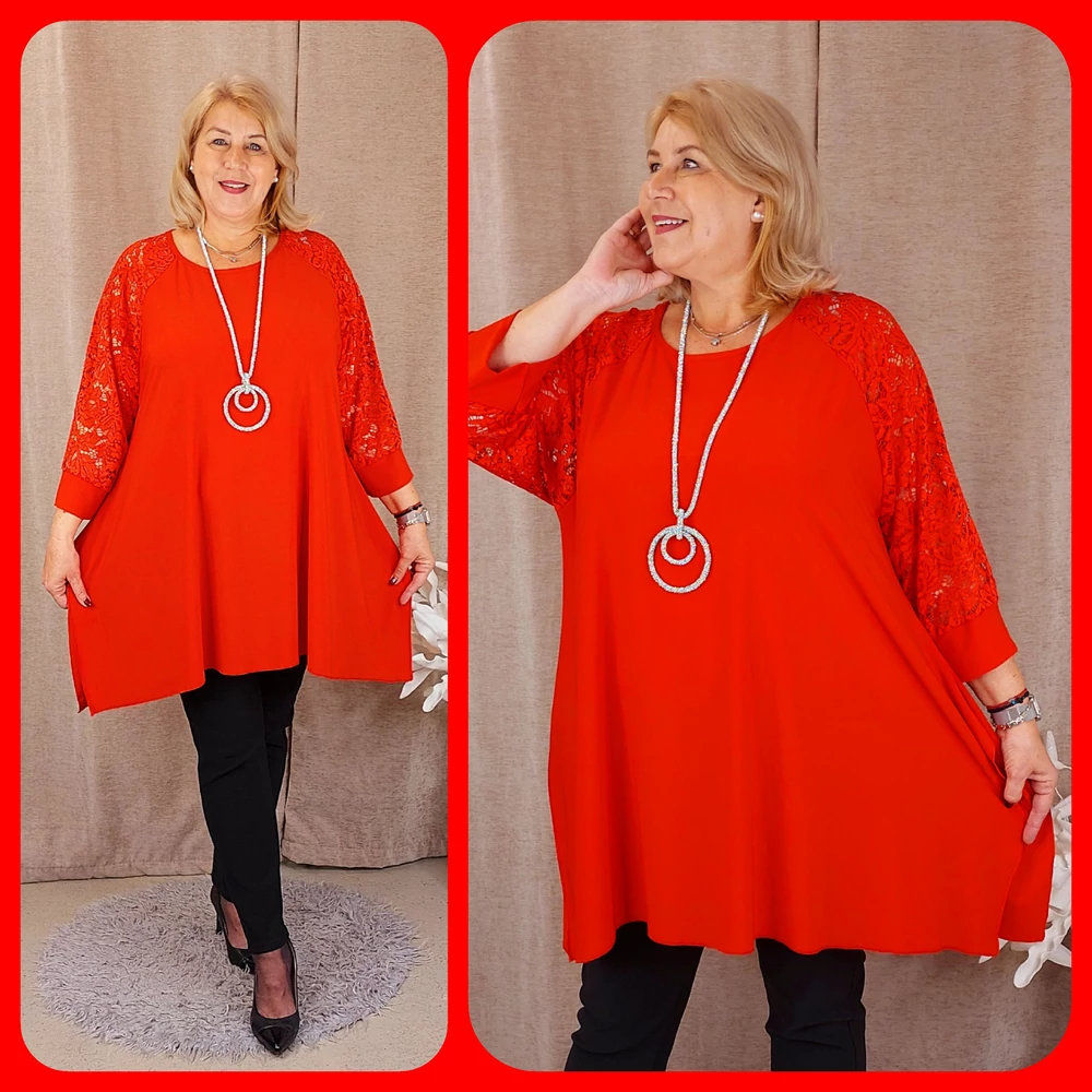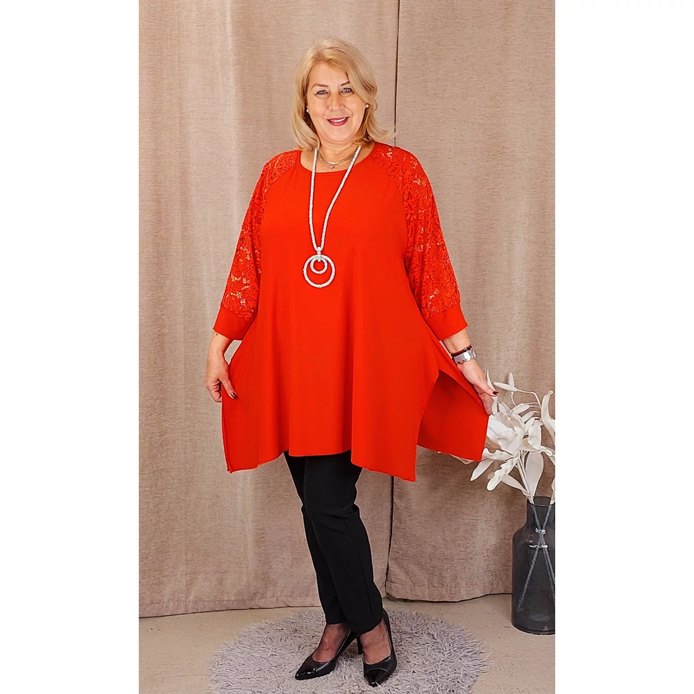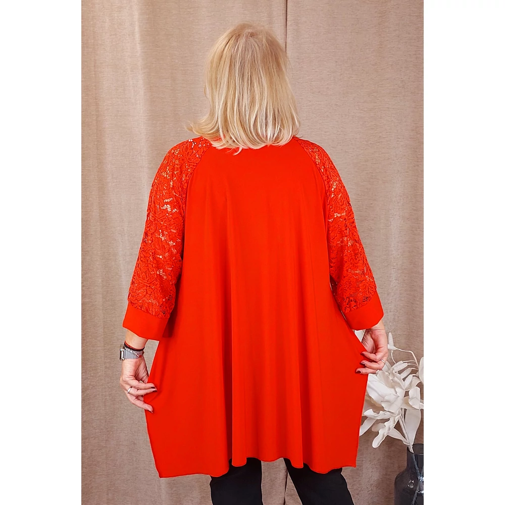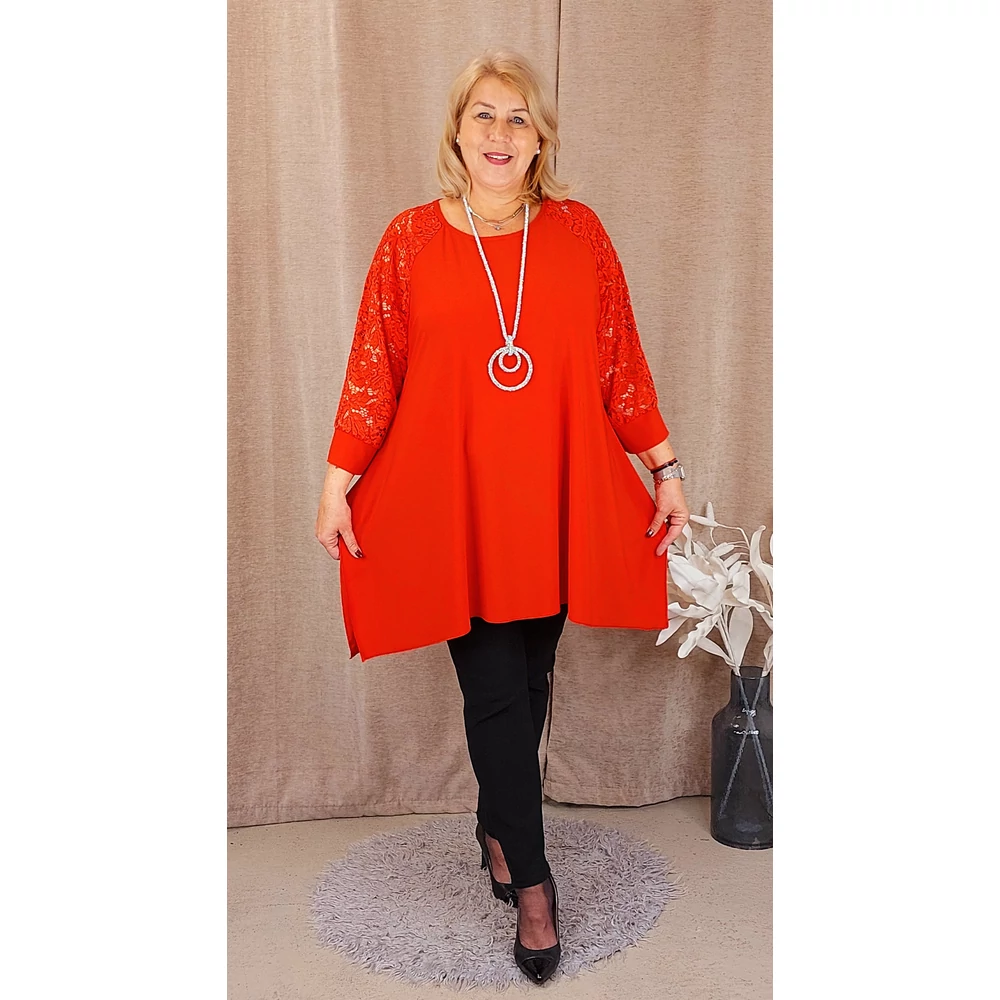 KEREK nyakú, CSIPKE ujjas felső - PIROS - 50-56 méret