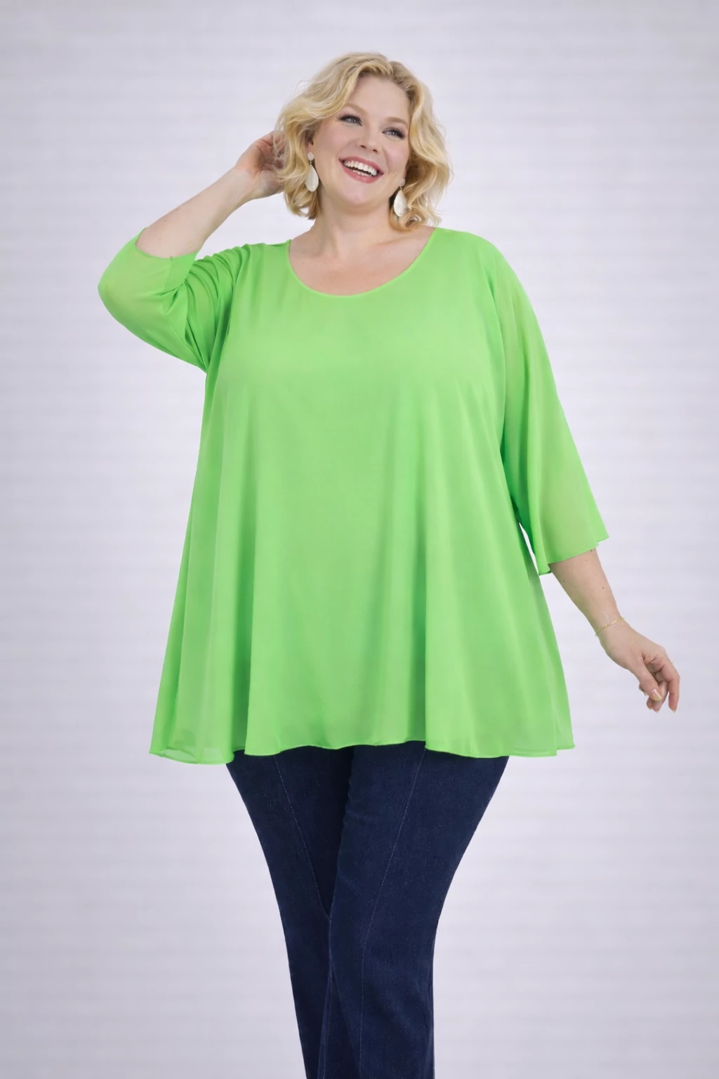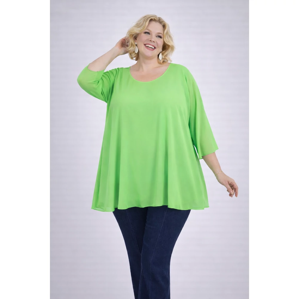 Lágy esésű, muszlin anyagú dekoratív blúz, alatta pamut trikóval, kerekített nyakkal,  ejtett vállakkal és pillangó,  3/4-es ujjakkal.