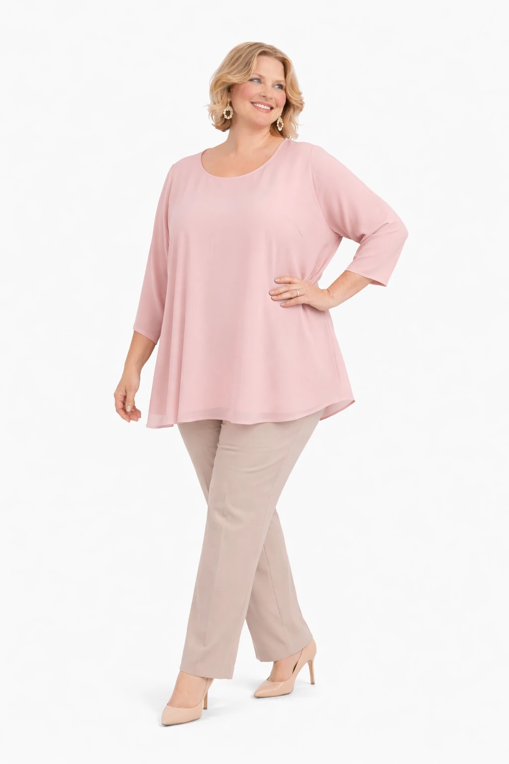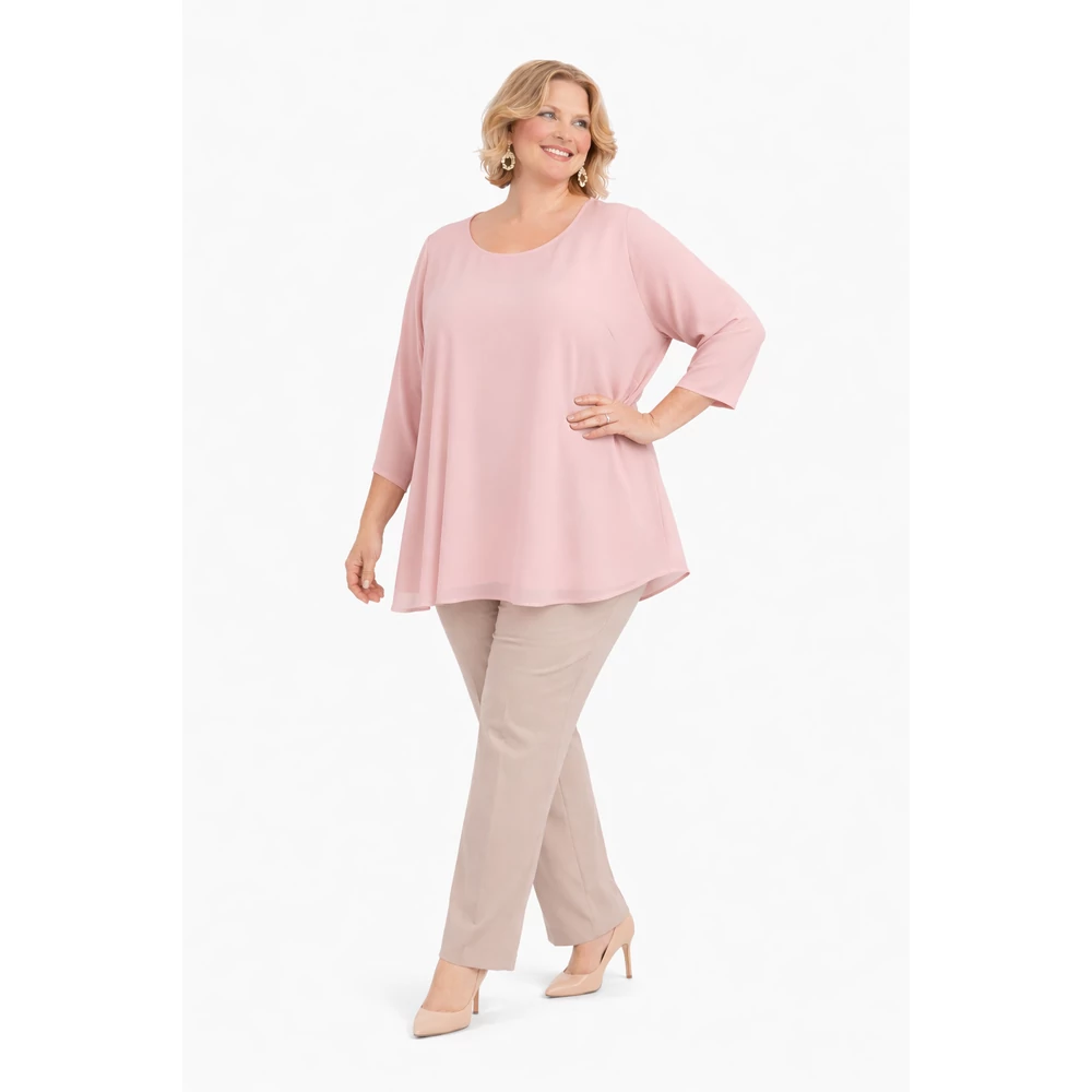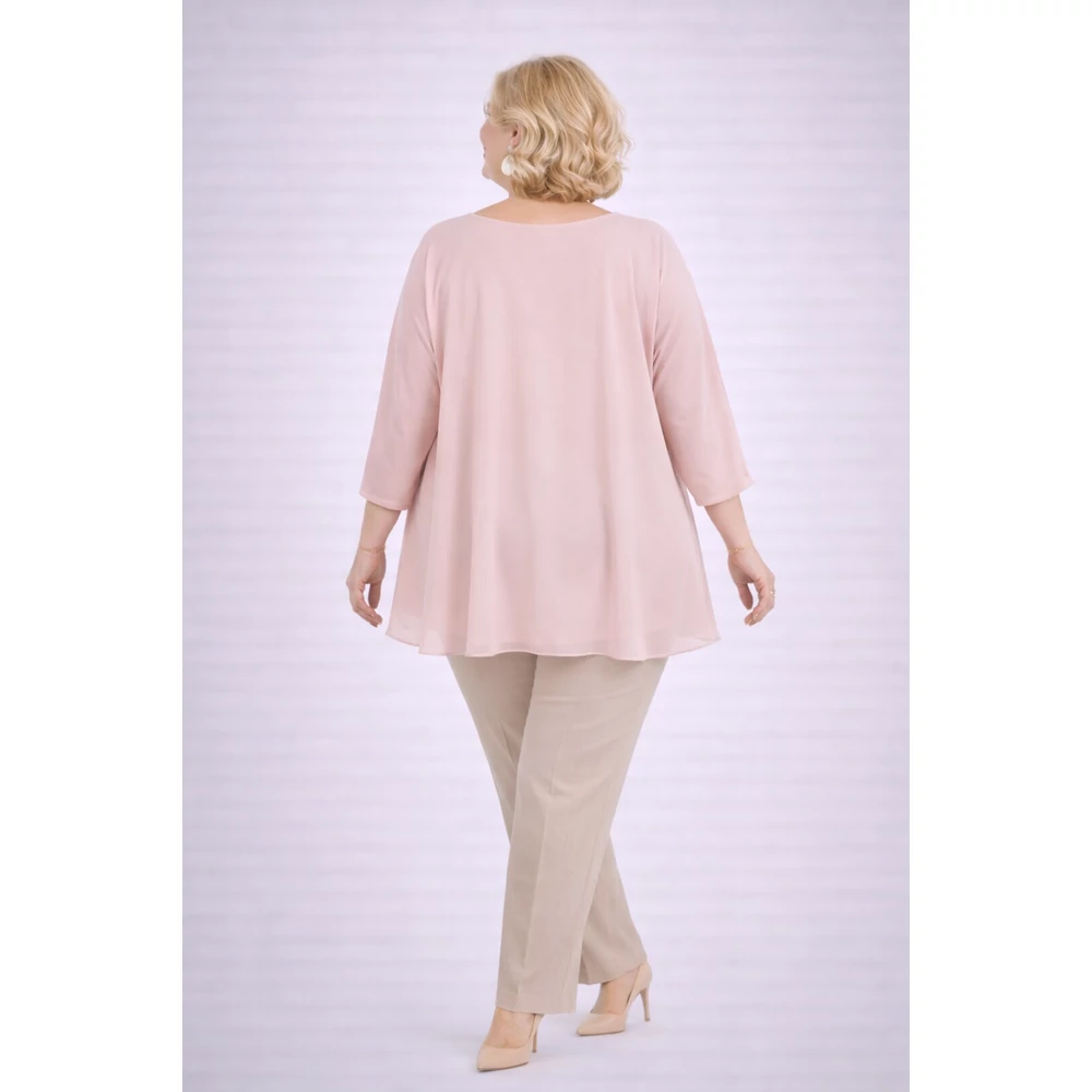 Lágy esésű, muszlin anyagú dekoratív blúz, alatta pamut trikóval, kerekített nyakkal,  ejtett vállakkal és pillangó,  3/4-es ujjakkal.
