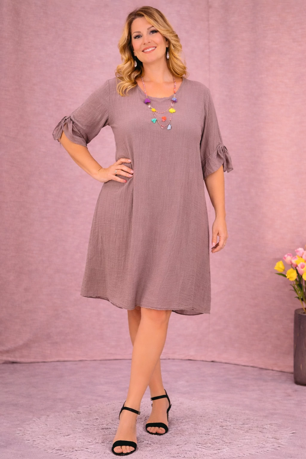 Kerekített nyakmegoldású, harang ujjakkal, 10 centis a ruha színével megegyező vékony vászon fodrokkal.