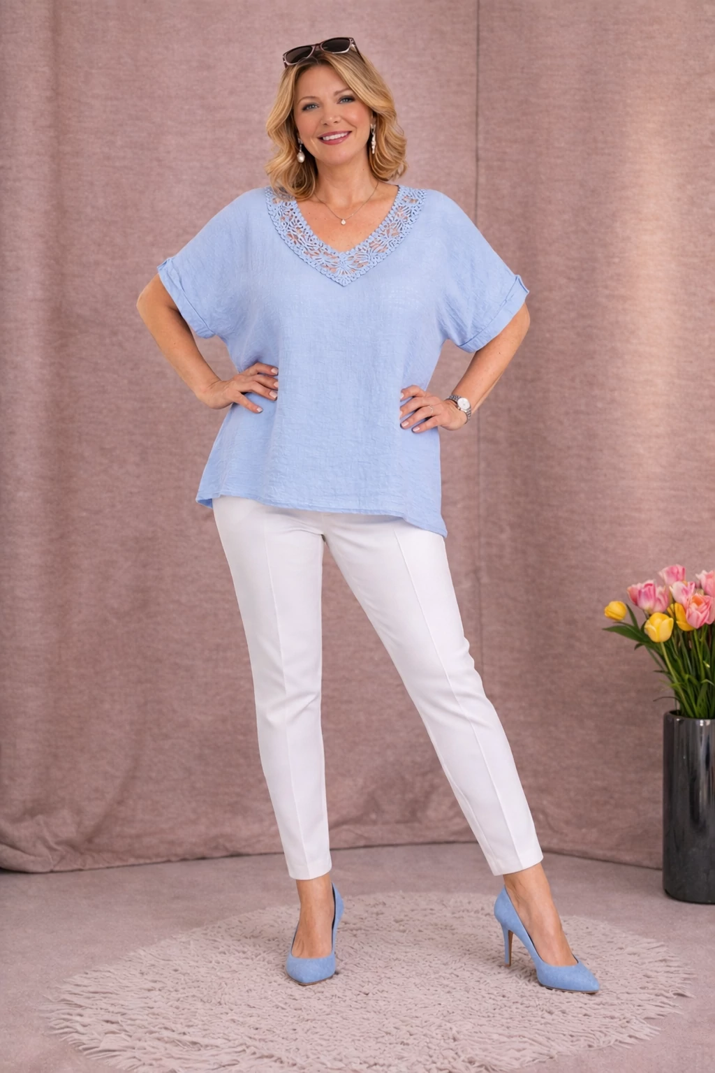 Szellős, kellemes viseletű, lágy nyári lenvászon anyagból készült elegáns felső, színével megegyező horgolt díszítéssel nyak részénél.