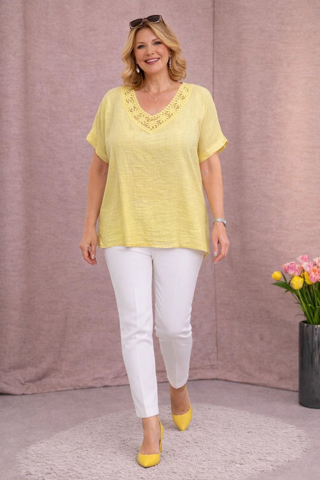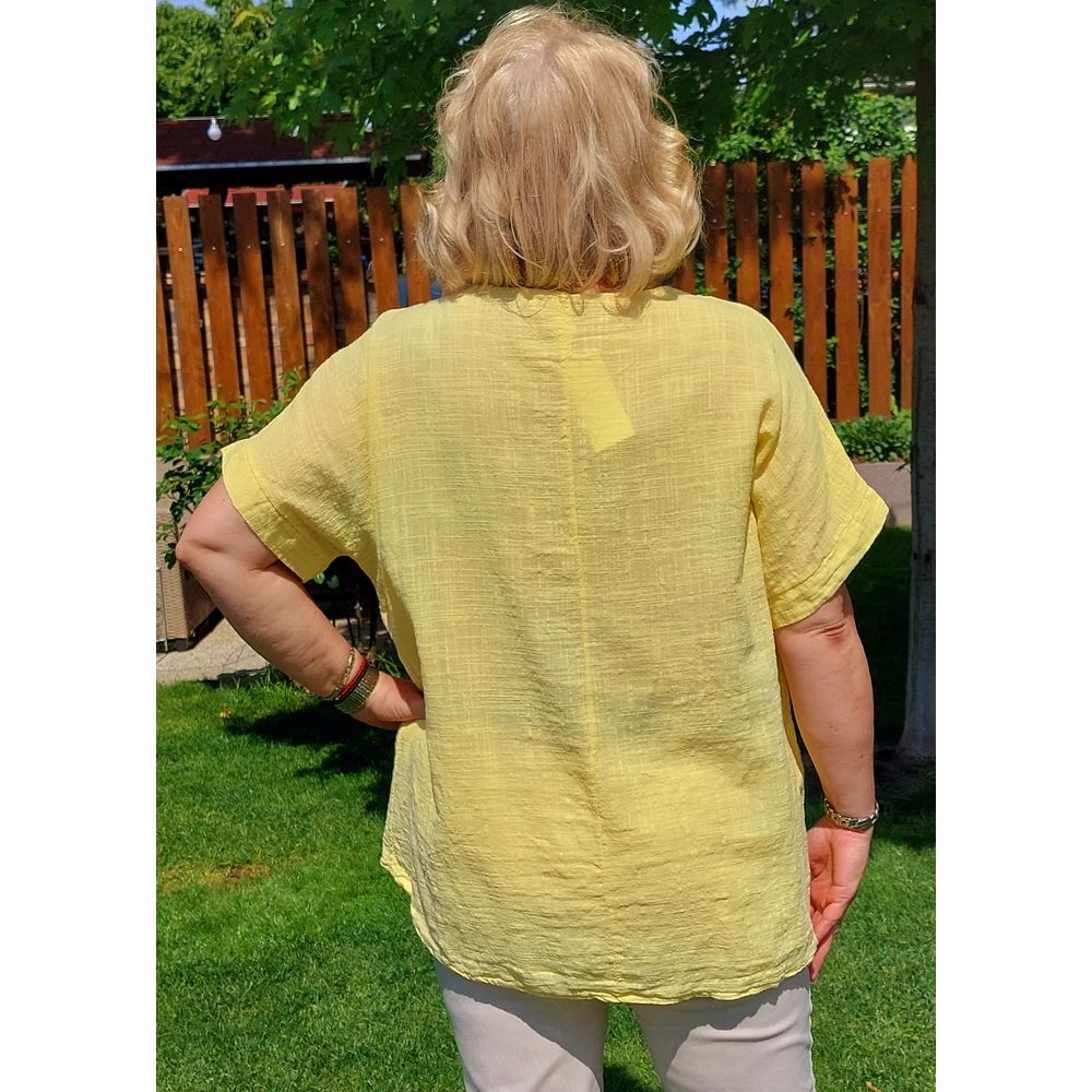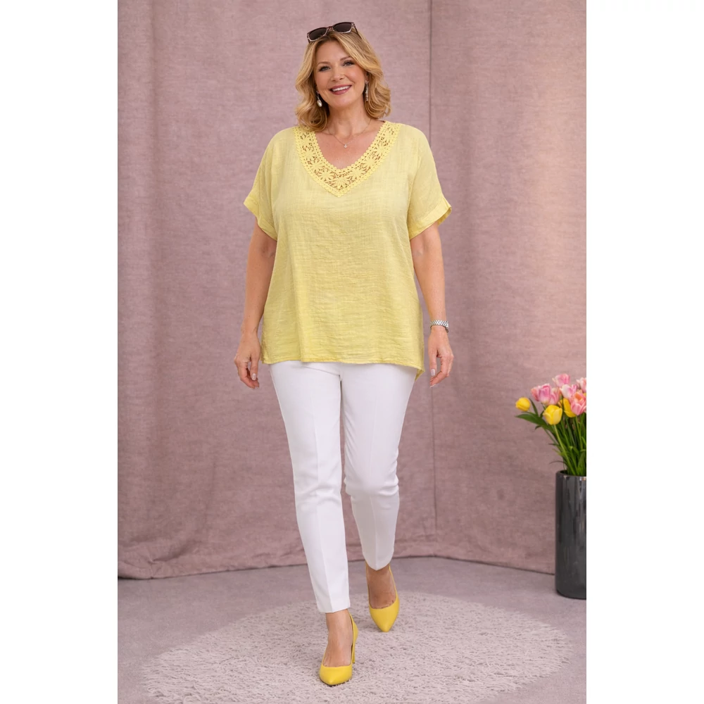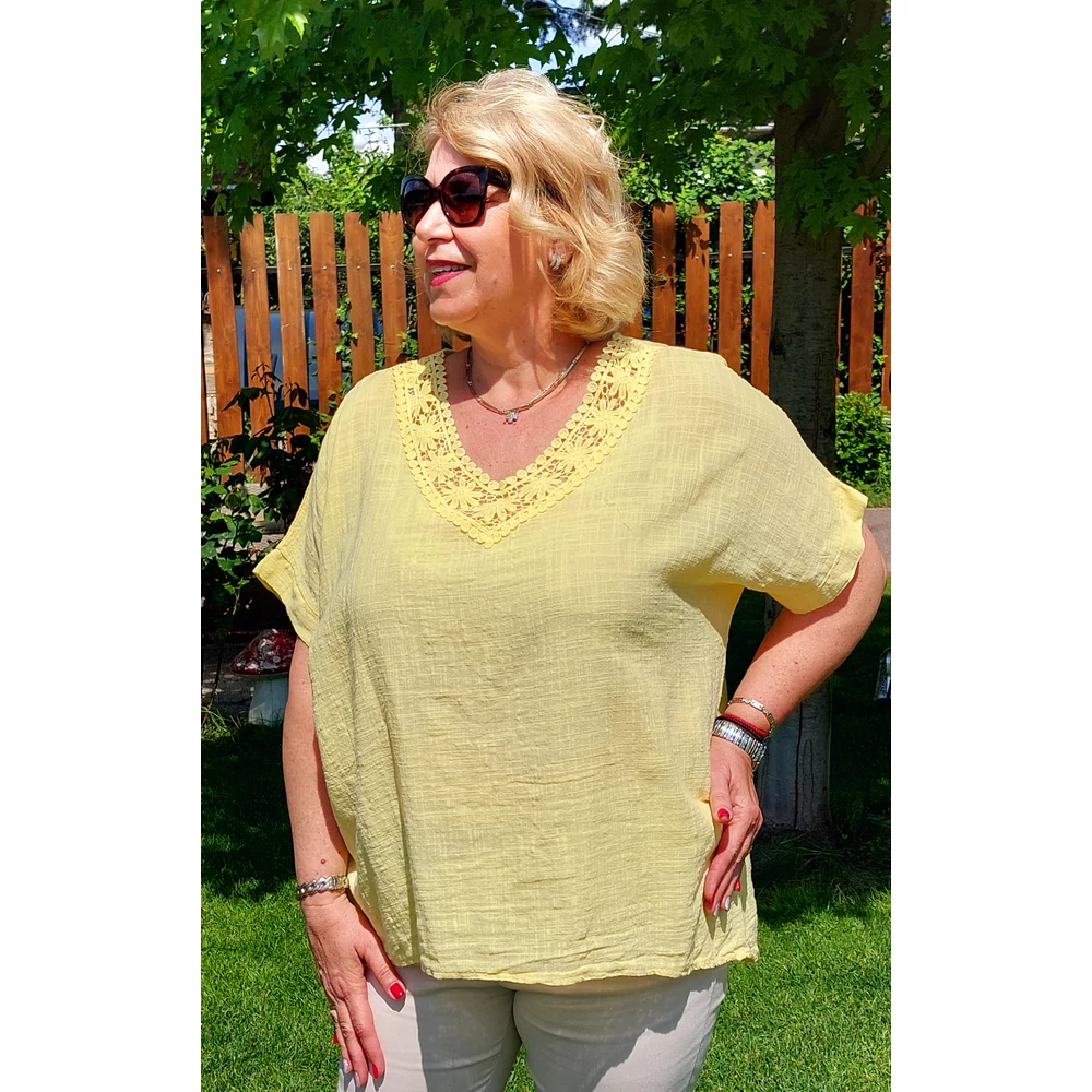 Szellős, kellemes viseletű, lágy nyári lenvászon anyagból készült elegáns felső, színével megegyező horgolt díszítéssel nyak részénél.