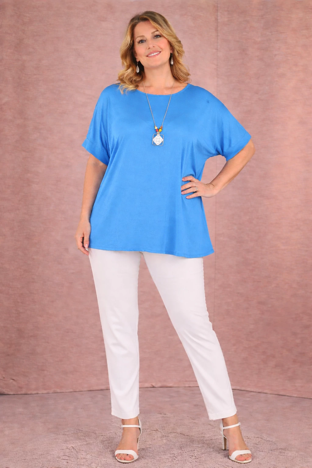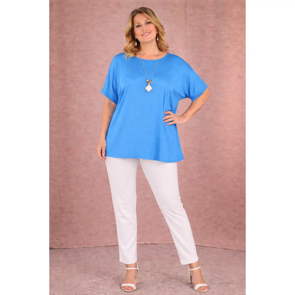 Kellemes viseletű, vasalást nem igénylő, elasztikus anyagból készült, praktikus, jól variálható felső, hozzá illő csinos nyaklánccal.
