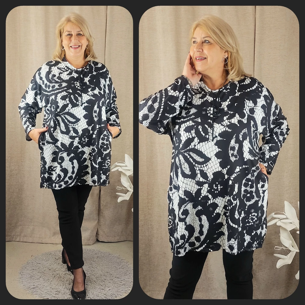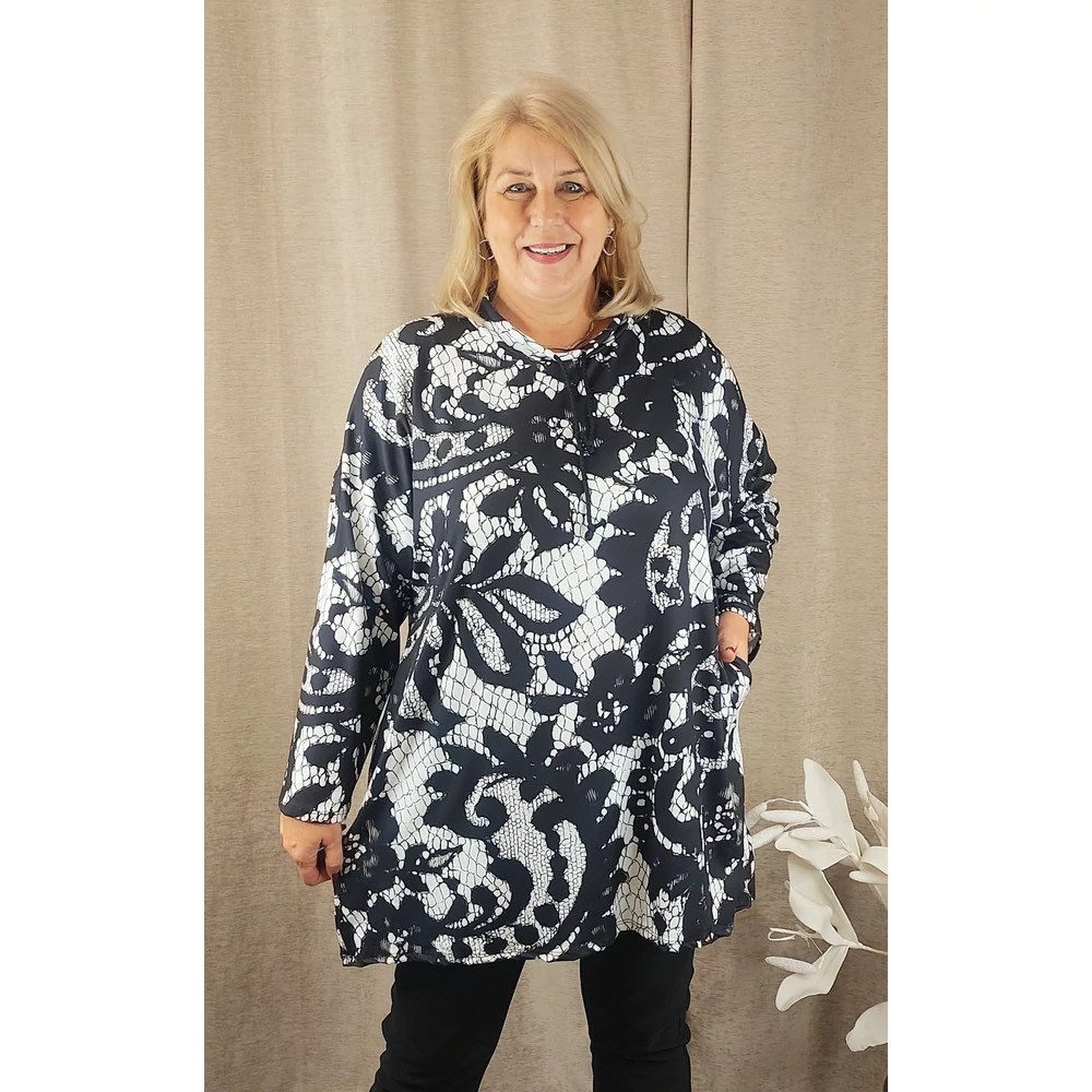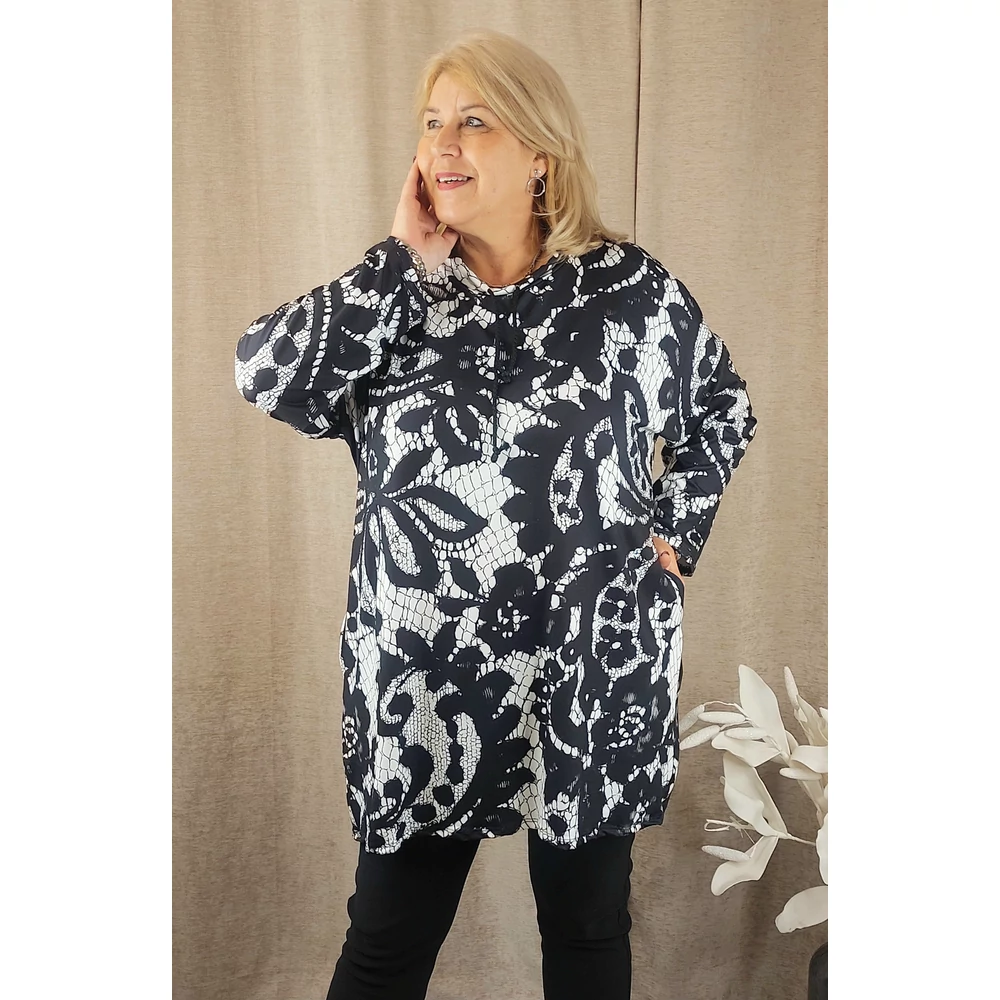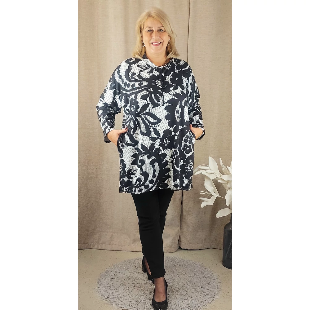 Kellemes viseletű, lágy esésű, puha hatású pamutselyem anyagból készült, csinos tunika vagy felső.