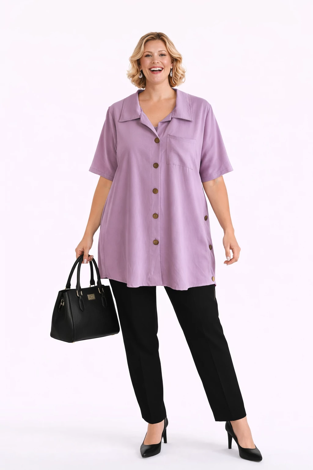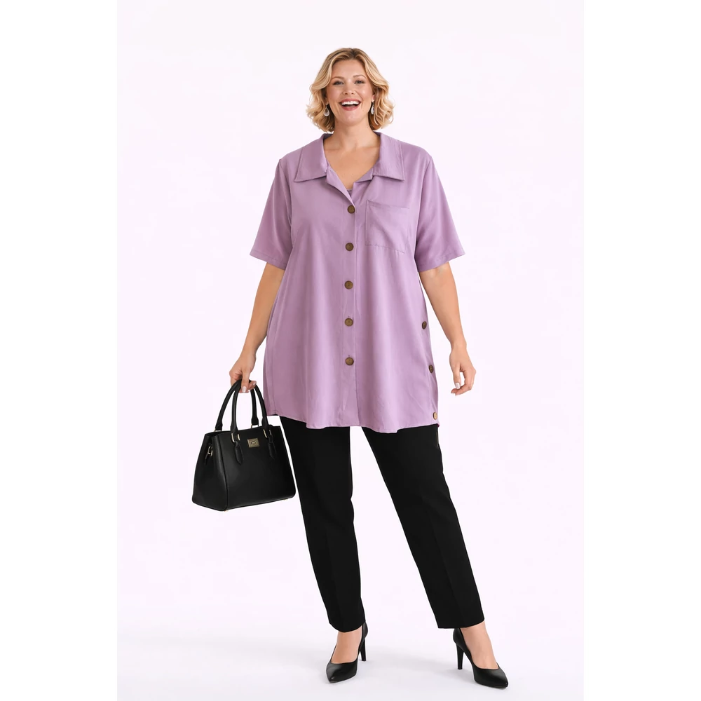 Kellemes viseletű, szellős, organikus viszkóz anyagból készült, divatos kókusz fa gombokkal díszített ingtunika a forró nyári napokra.