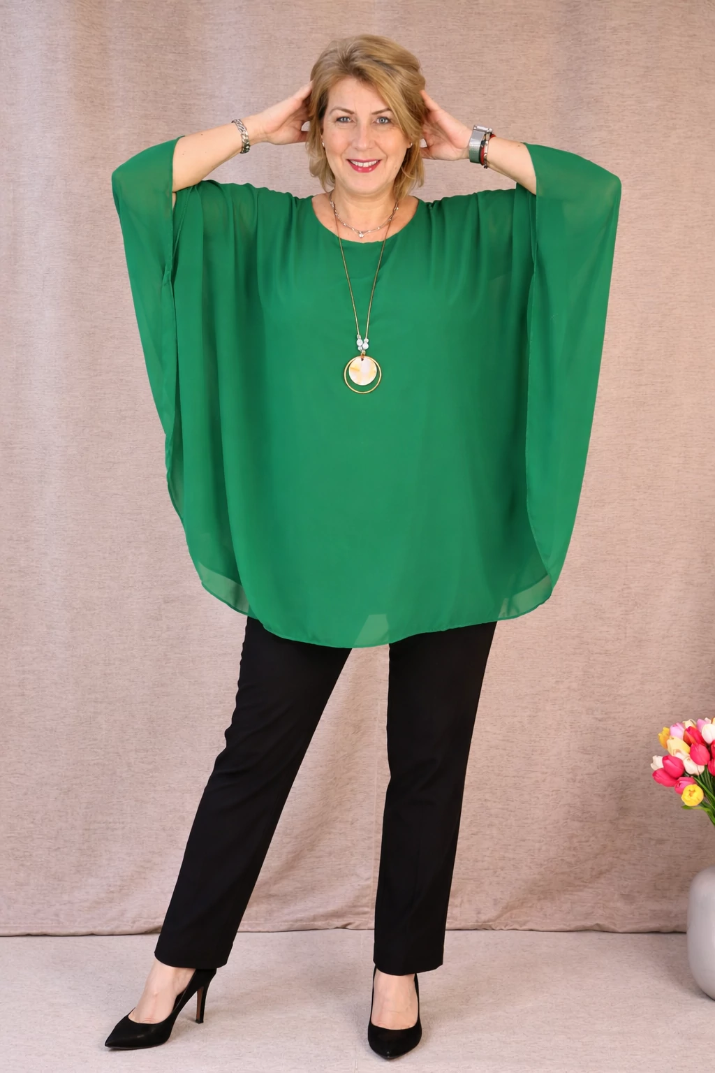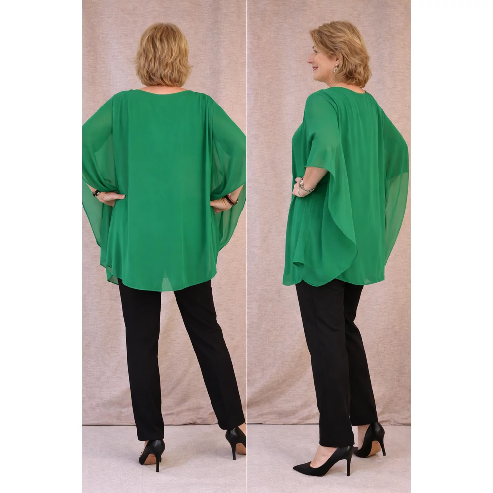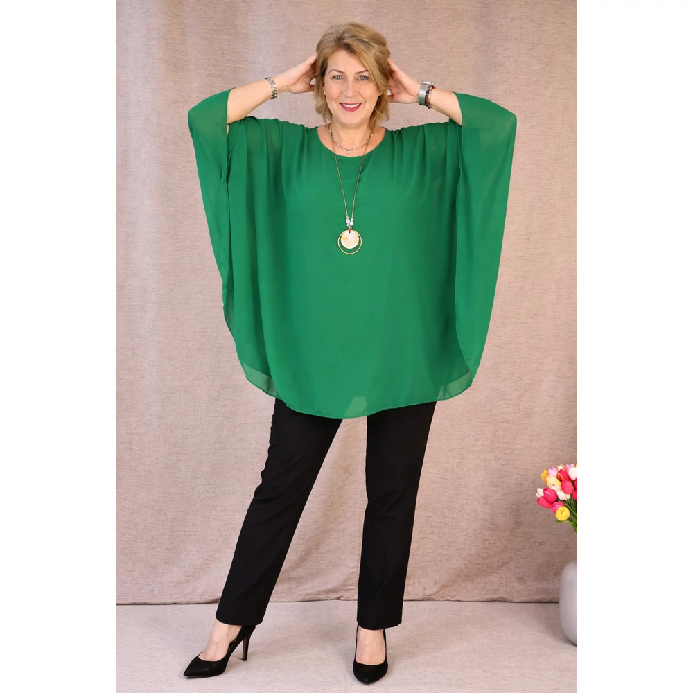 Lágy esésű, muszlin anyagú dekoratív blúz, alatta pamut trikóval egybevarrva, kerekített nyakkal, rövid ejtett vállakkal és ujjánál tűzött, pillangó jellegű ujjakkal. Hozzá tartozó dekoratív nyaklánc dobja fel ezt az elegáns felsőt.